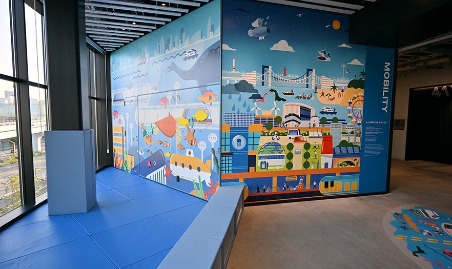 アリーナの重点テーマである「モビリティ」を表現した展示、キッズエリア。すきなパーツを組み合わせて、オリジナルのクルマを制作できるコーナーや、クッション遊具ゾーンを設置し、お子様も遊べるスペースも。