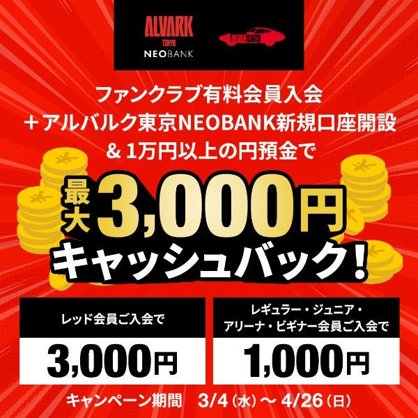 ファンクラブ入会&アルバルク東京NEOBANK新規口座開設キャッシュバックキャンペーンのお知らせ