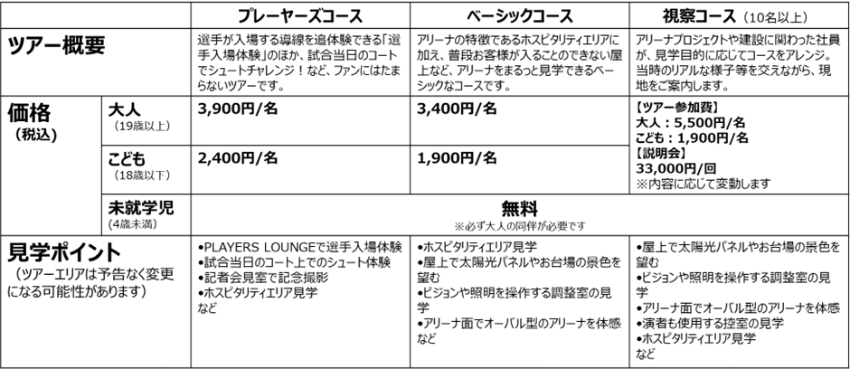 ツアーは全部で3つのコースをご用意しています。今回は「プレーヤーズコース」「視察コース」のみ受付を実施いたしますが、今後の日程が確定し次第、TOYOTA ARENA TOKYO公式WEBサイト等で随時発表させていただきます。