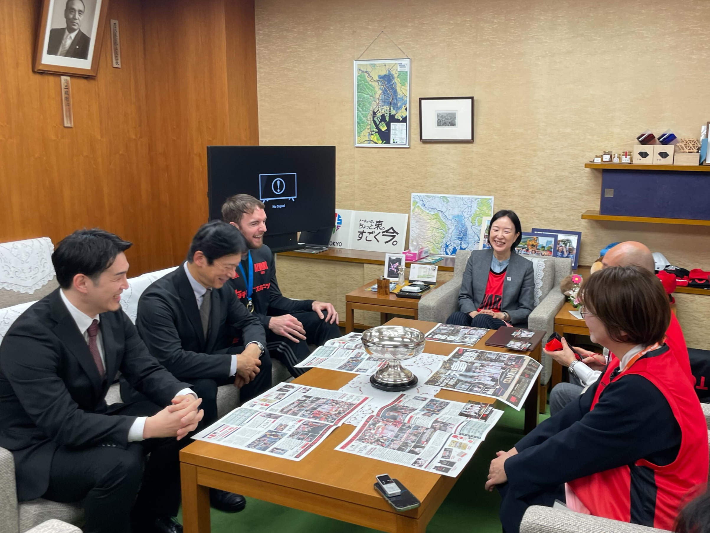 2026年2月26日(木)、代表取締役社長 林 邦彦と #10ザック・バランスキー選手、ゼネラルマネージャー 伊藤 大司 が江東区大久保区長、本多教育長を表敬訪問し、第101回天皇杯全日本バスケットボール選手権大会優勝を報告しました。