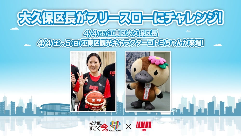 4月4日(土)は江東区大久保区長が来場され、フリースローチャレンジで会場を盛り上げていただきます。