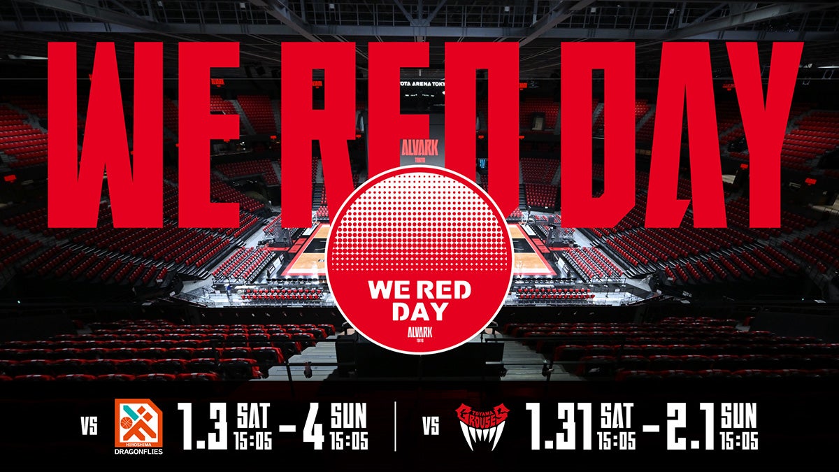 今シーズンも2025年1/3(土)1/4(日)、1/31(土)2/1(日)に行うホームゲーム4試合を対象に実施いたします。 アルバルク東京のチームカラーである情熱や闘争心を掻き立てる色“RED”。その“RED”で会場内を埋めつくし、より一体感のあるアリーナをつくりたい!「WE RED DAY」の特別感をファンの皆さんに楽しんでいただきたい!そんな願いを込めた「WE RED DAY」。今年もファンの皆さまと共に会場を創り、盛り上げていきます! - ②「WE RED DAY」の4日間は、選手も赤の「FANユニフォーム」を着て戦います!ユニフォーム型ノースリーブや限定クリアファイルなどの来場者プレゼントも企画中!