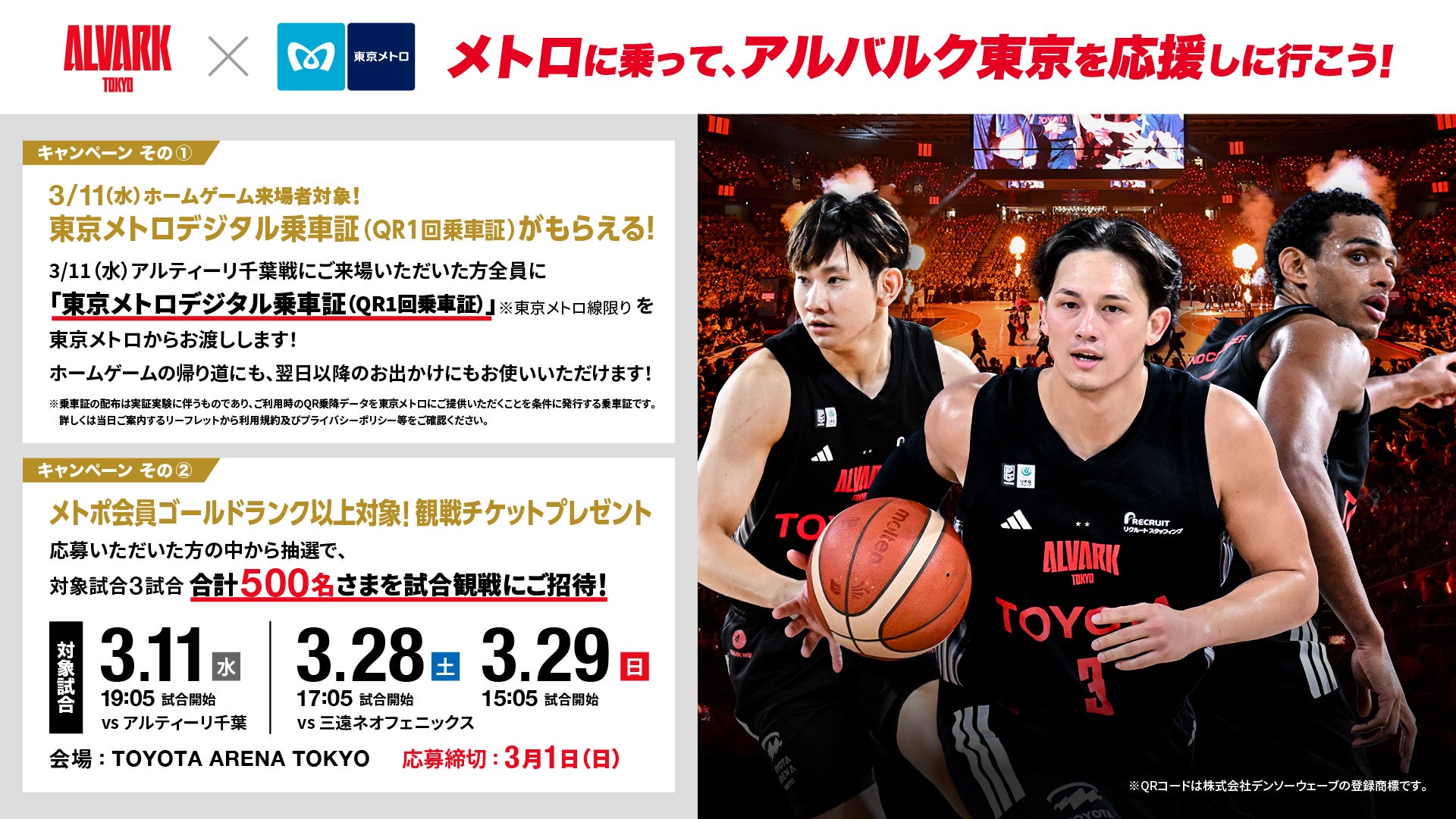 この度、アルバルク東京は、東京地下鉄株式会社(以下「東京メトロ」)と連携し、東京メトロに乗れる「東京メトロデジタル乗車証(QR1回乗車証)」や、アルバルク東京ホームゲームの観戦チケットがもらえる2つのキャンペーンを実施します!