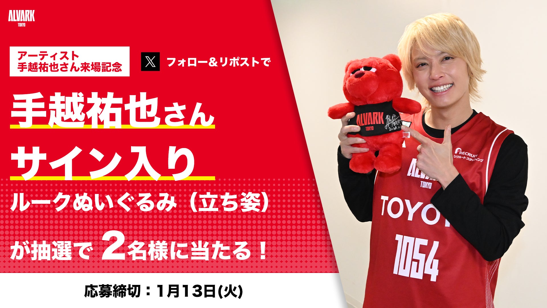 アルバルク東京公式Xのフォロー&リポストで「手越祐也さん"サイン入りルークぬいぐるみ(立ち姿)”」を抽選でプレゼントいたします!