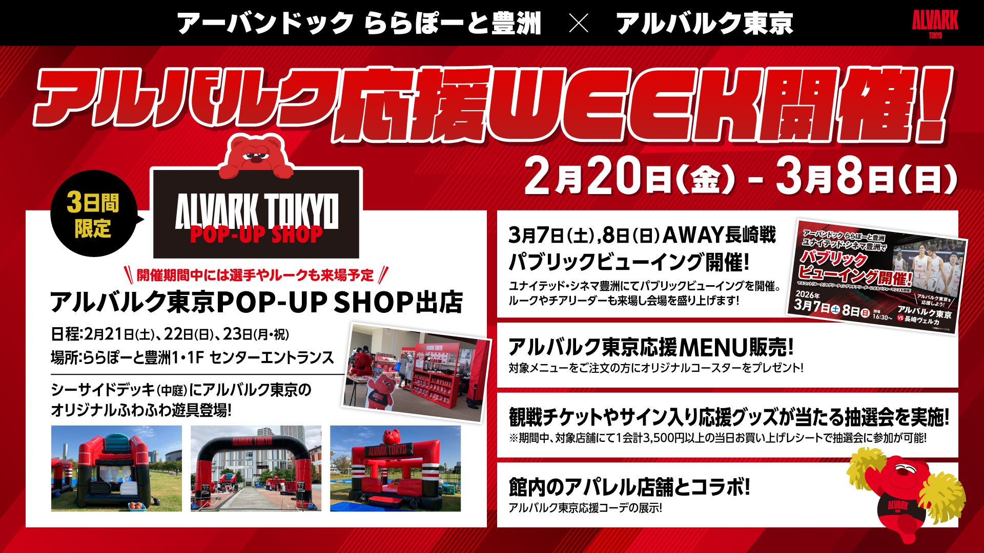 この度、2026年2月20日(金)~3月8日(日)の期間、アーバンドック ららぽーと豊洲にて「アルバルク応援WEEK」を開催することが決定いたしました。