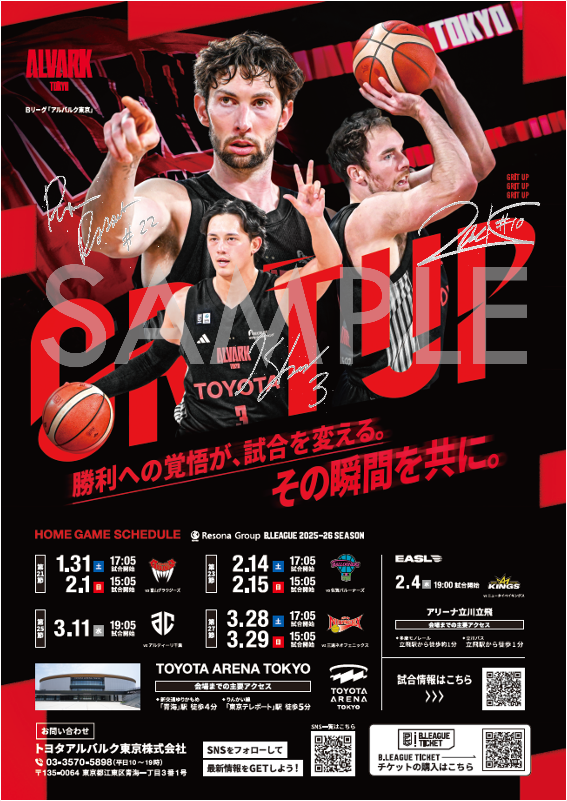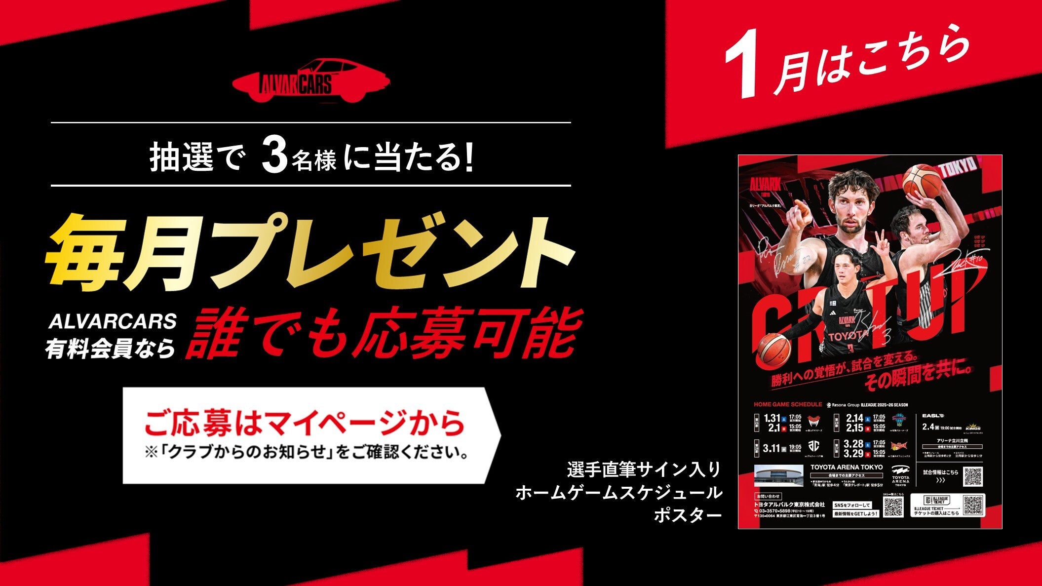 いよいよ、りそなグループ B.LEAGUE2025-26シーズンも折り返し。1月31日(土)富山グラウジーズ戦~3月29日(日)三遠ネオフェニックス戦までのホームゲームスケジュール入りポスター(非売品)に、掲載3選手のサインが入った貴重な一品をプレゼントいたします。後半戦もアルバルク東京への熱いご声援をお願いいたします!