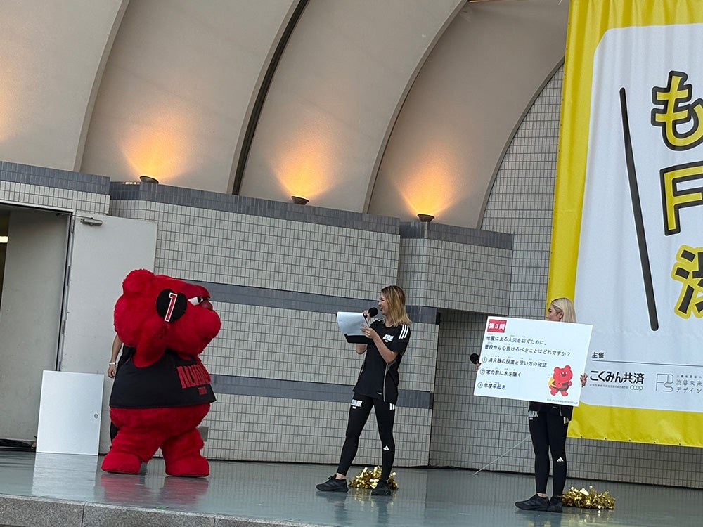 アルバルクチアリーダーのERINAとKU、ルークが登壇し「防災ダンス」と「防災クイズ」を行いました。