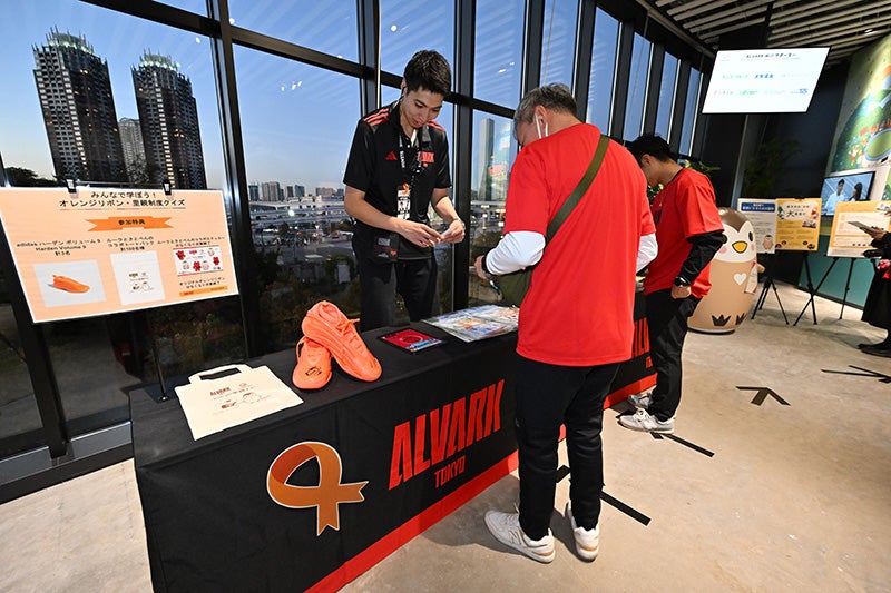 クイズに参加された方には、アルバルク東京のマスコットキャラクター「ルーク」と東京都里親制度普及啓発キャラクター「さとぺん」のオリジナルコラボステッカーと、オレンジリボンをプレゼントし、全問正解された方は、#9 安藤周人選手、#25 福澤晃平選手のサイン入りオレンジバッシュや、ルークとさとぺんのオリジナルコラボトートバックが当たる抽選に参加いただきました。