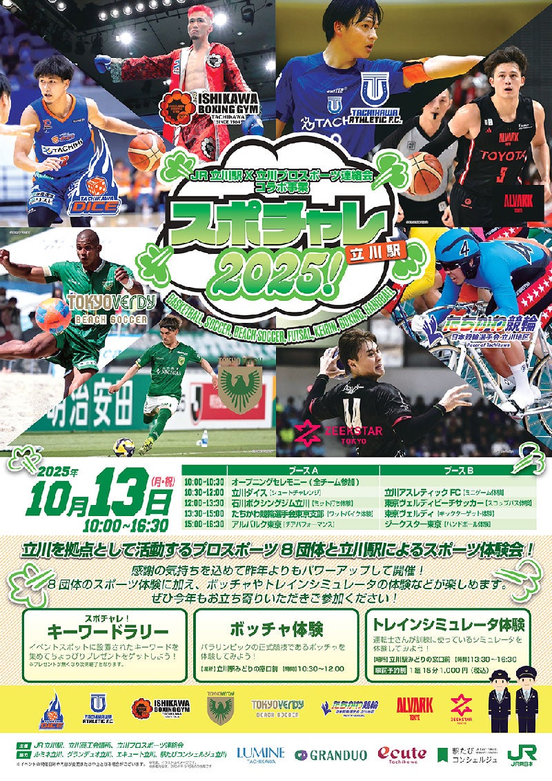 スポチャレ立川駅2025!は、立川駅と立川市を拠点として活動するプロスポーツ団体「立川プロスポーツ連絡会」で実施する、スポーツの秋を立川で楽しむイベントです。各スポーツチームの体験イベントやお子さまも気軽に楽しめるJR東日本トレインシミュレータ体験やキーワードラリーも開催します。