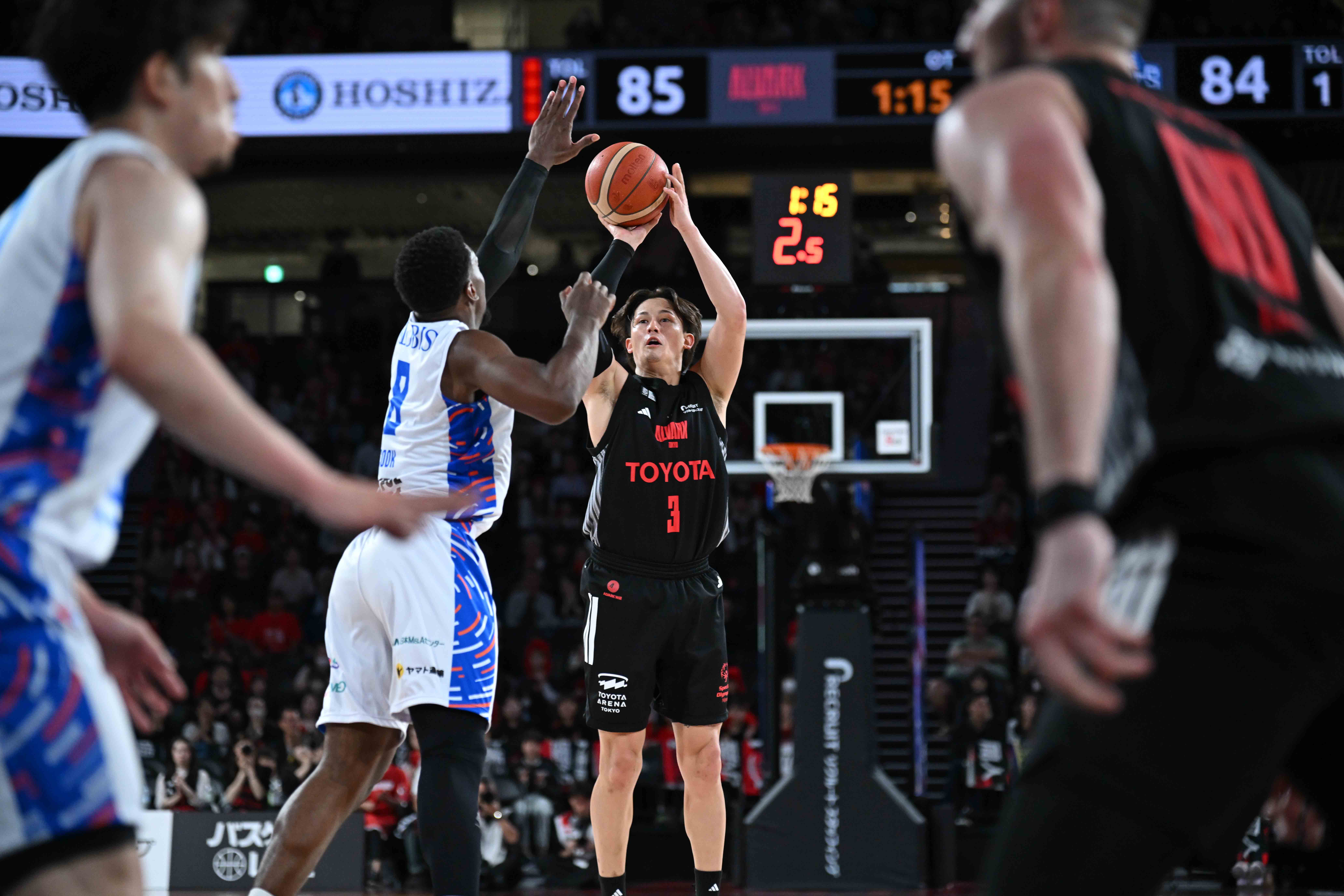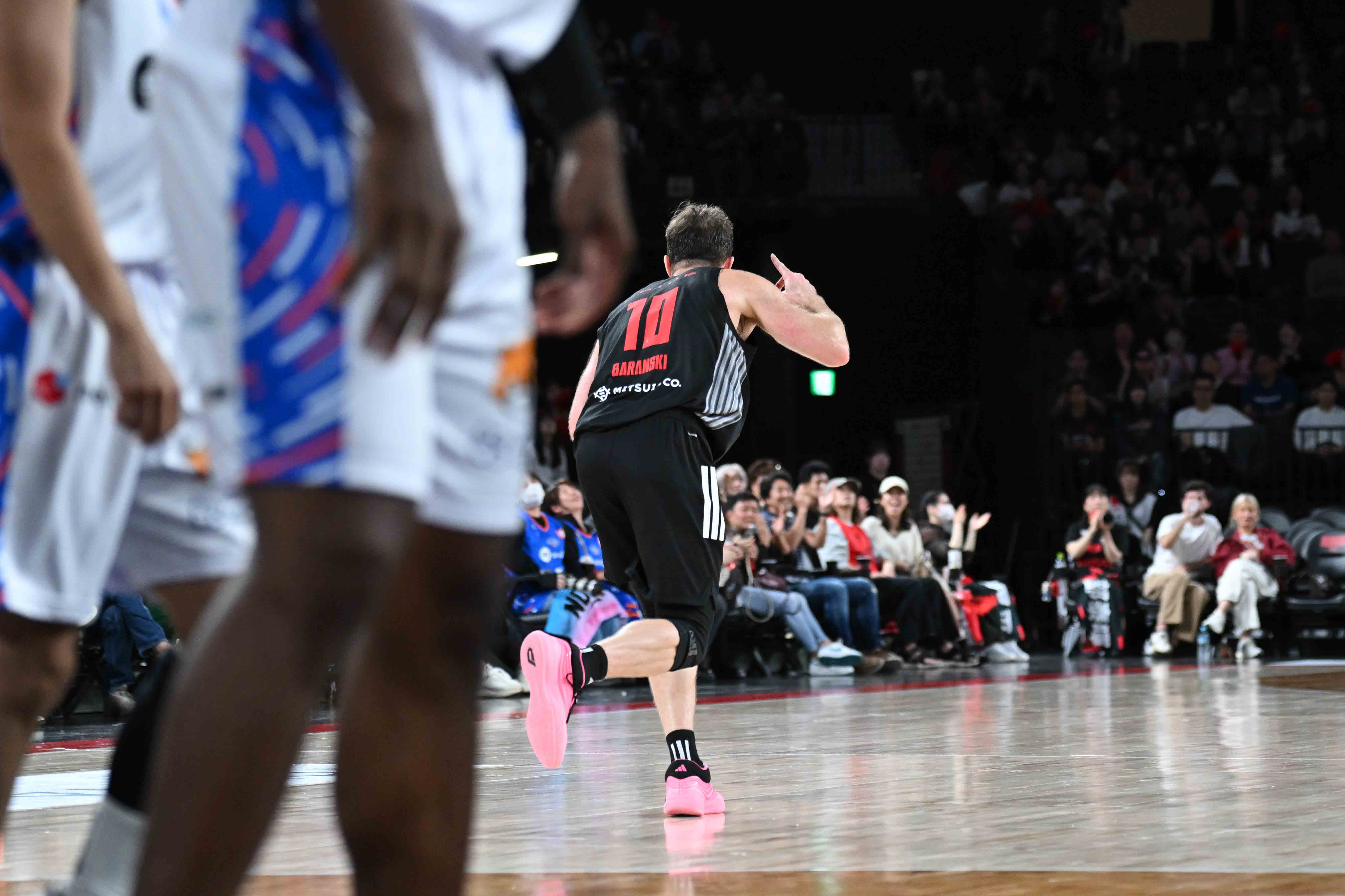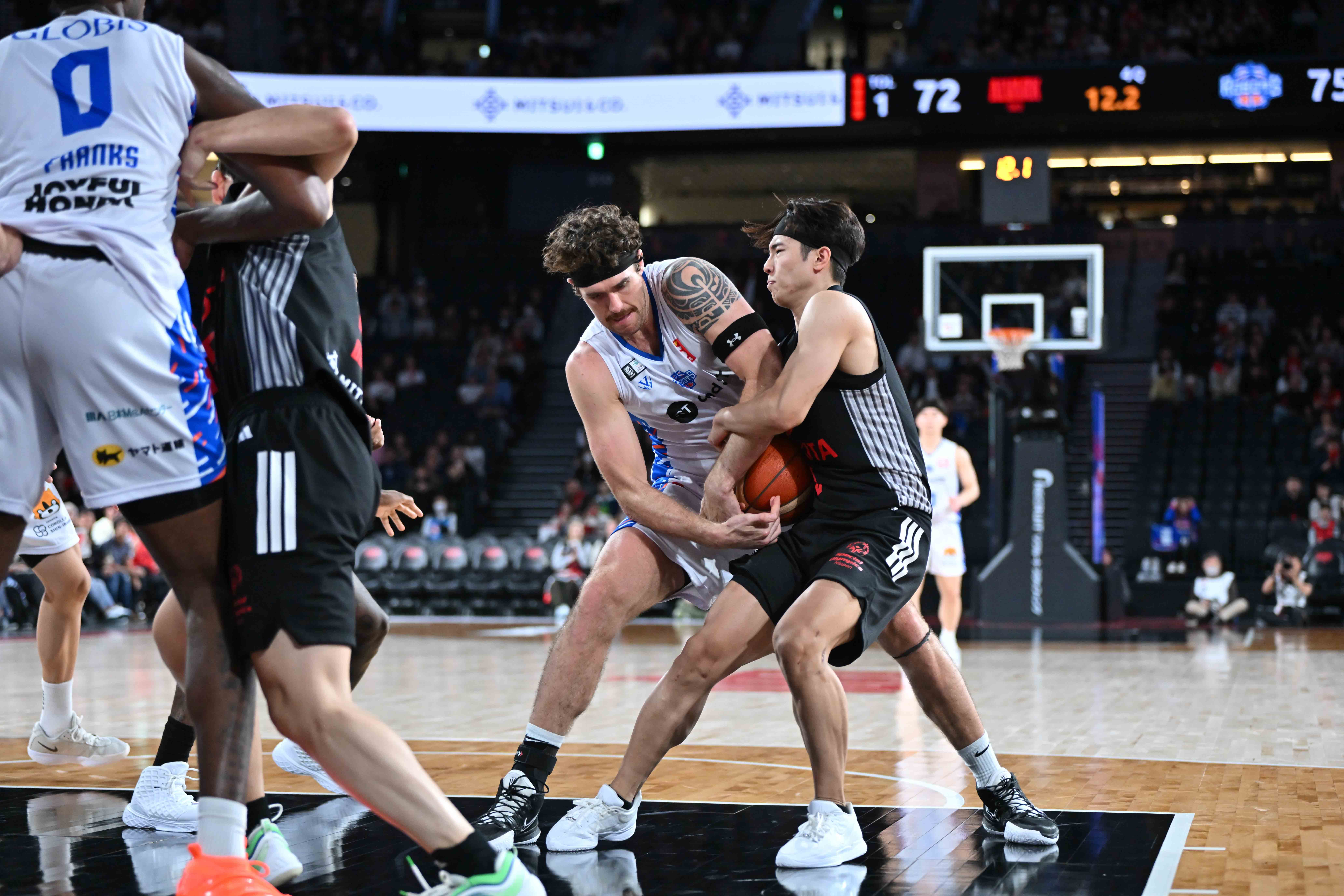 スターターは、#3 テーブス、#9 安藤、#10 ザック、#11 サイズ、#75 小酒部。1Q、#3 テーブスがドライブからファウルを獲得し、フリースローで先制点を挙げる。その後は一進一退の展開が続く中、#17 フォスターが巧みなパスで相手ディフェンスを切り崩していく。両チームともファウルがかさむものの、ボールを奪うと素早いトランジションからアグレッシブにリングを狙う姿勢を見せる。終盤には、#75 小酒部の3ポイントシュートが決まり、わずかにリードを奪い、2点リードで最初のクォーターを終える。2Q、序盤からターンオーバーが続いてリズムを掴めない。相手に連続得点を許して逆転される。その後は決めれば決め返しリードチェンジを繰り返すが苦しい展開。#17 フォスターの得点で踏ん張り、#10 ザックが3ポイントを沈めて一時同点に。しかし、最後に相手の勢いを止めきれず3点を追いかけて後半戦へ。3Q、#17 フォスターが3ポイントを沈めて先制。その後もフォスターを中心に得点を重ね、#10 ザックの3ポイントで一時逆転に成功する。しかし、相手もすかさず得点を返し、一進一退の展開が続く。インサイドではファウルがかさみ、ディフェンスでの対応が難しい時間帯もあったが、#3 テーブスがスティールから速攻に持ち込むプレーで流れを引き寄せる。さらに、#75 小酒部も果敢なドライブで応戦し、チームを勢いづける。徐々にディフェンスでもリズムをつかみ始め、じわじわとリードを広げる。6点のリードで最終クォーターへ。4Q、開始早々に連続得点を許し、1ポゼッション差まで詰め寄られる苦しい展開に。それでも粘りを見せ、#11 サイズの得点で再び4点差とし、オフィシャルタイムアウトへ。その後、#2 大倉が大きな3ポイントシュートを沈めて再び流れを引き寄せる。しかし、相手も粘り強くアタックを続け、接戦が続く中、体を張ってプレーしていた#10 ザックがファウルアウトに。その後もクロスゲームは続き、残り31秒、逆転を許し、チームは苦しい状況に追い込まれる。さらに残り12秒、相手のフリースロー1本目が決まり3点ビハインド。2本目はリングに弾かれるが、それを#2 大倉がリバウンド。すぐさま#17 フォスターに繋ぐと、フォスターが勝負強さを発揮し、自ら攻め上がってバスケットカウントを獲得!フリースローも沈め、残り6秒で劇的に同点に追いつく。試合は激闘の中、オーバータイムへ突入。OT1、ファーストオフェンスで#17 フォスターから#00 スティーブへのアリウープが決まり良い流れが続く。相手にも粘られ得点を取られるも、#9 安藤の3ポイント、そしてショットクロックが迫る中#3 テーブスが気迫の1on1で3ポイントを沈める。4点をリードした残り38秒、#9 安藤と#00 スティーブのピックアンドロールからダメ押しとなる#00 スティーブのレイアップが決まり勝負あり。最後までどちらに転ぶかわからない拮抗した激戦、最後に勝負強くシュートを決め切り勝利を掴み取った。
