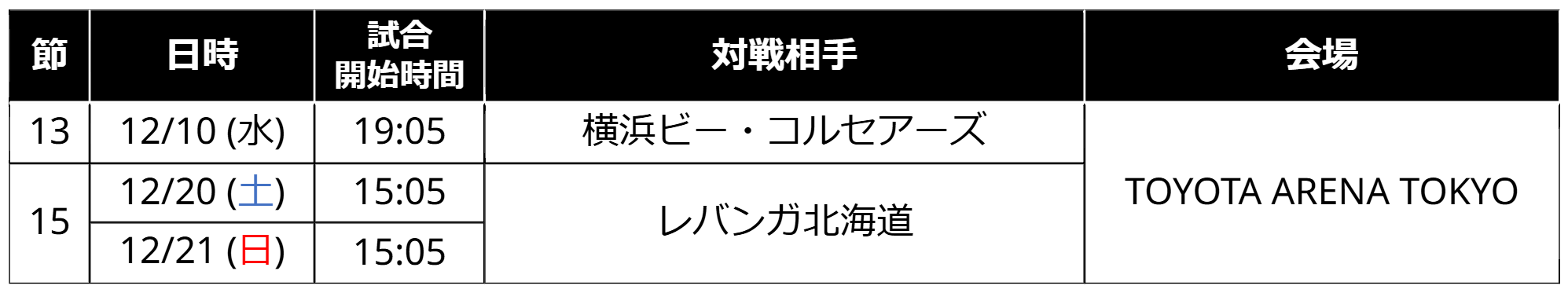 - 対象試合:12月10日(水)横浜ビー・コルセアーズ戦