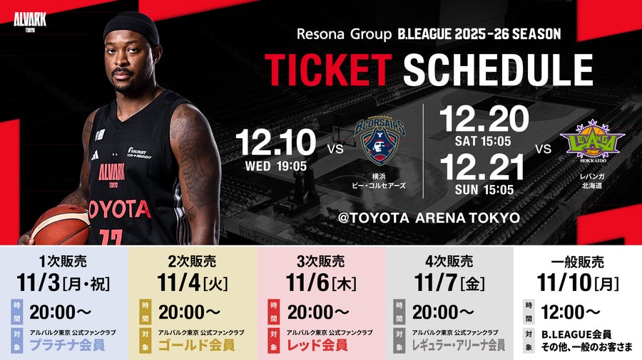 2025年11月3日(月・祝) 20:00より、りそなグループ B.LEAGUE 2025-26 SEASONの第13節 横浜ビー・コルセアーズ戦、第15節 レバンガ北海道戦のホームゲームチケット販売を開始いたします。