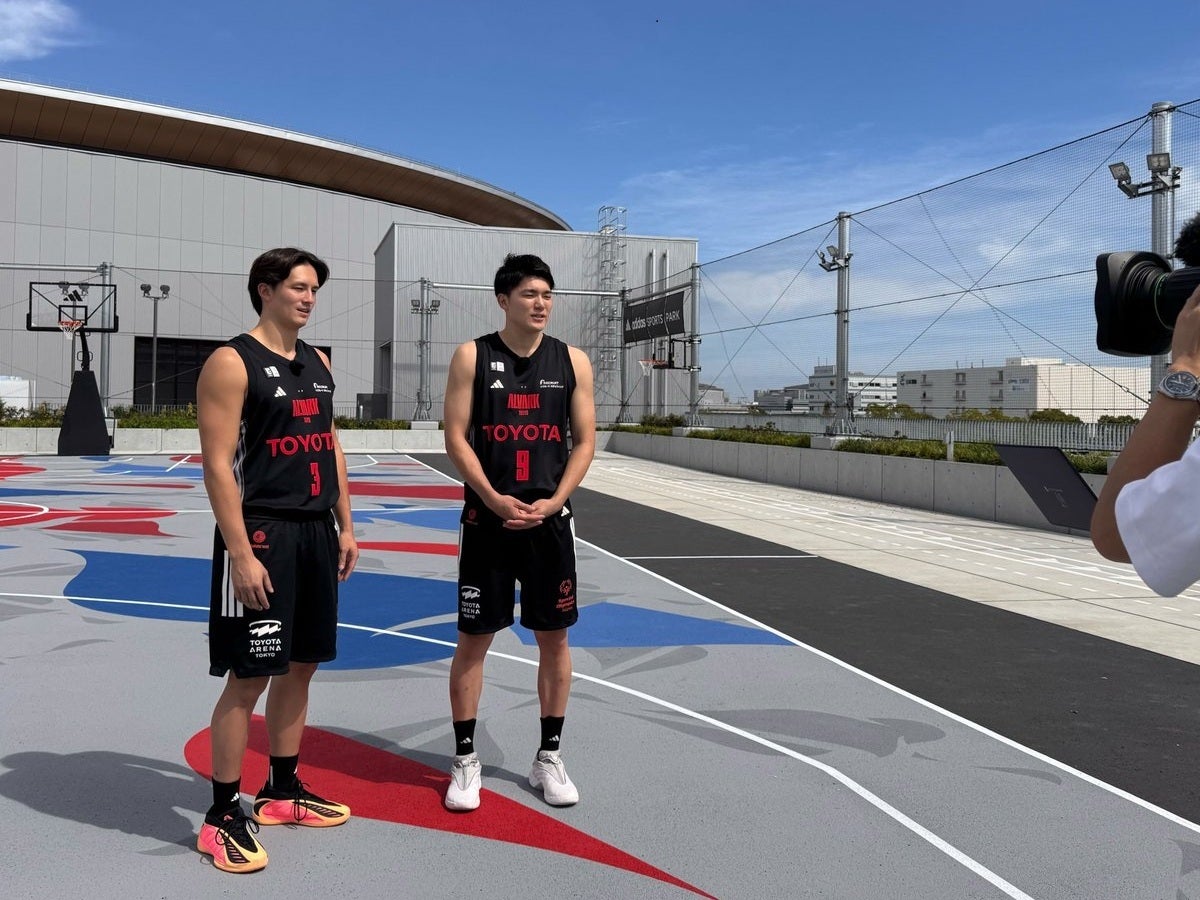 ホームゲームなどでシューズを回収してから、コートになるまでの過程も取材いただき、完成後には#3 テーブス海選手、#9 安藤周人選手にインタビューしていただきました。