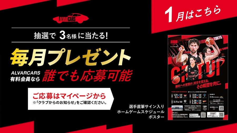 アルバルク東京公式ファンクラブ「ALVARCARS」 では、毎月様々な賞品をプレゼントする「毎月抽選プレゼント」を実施しております。