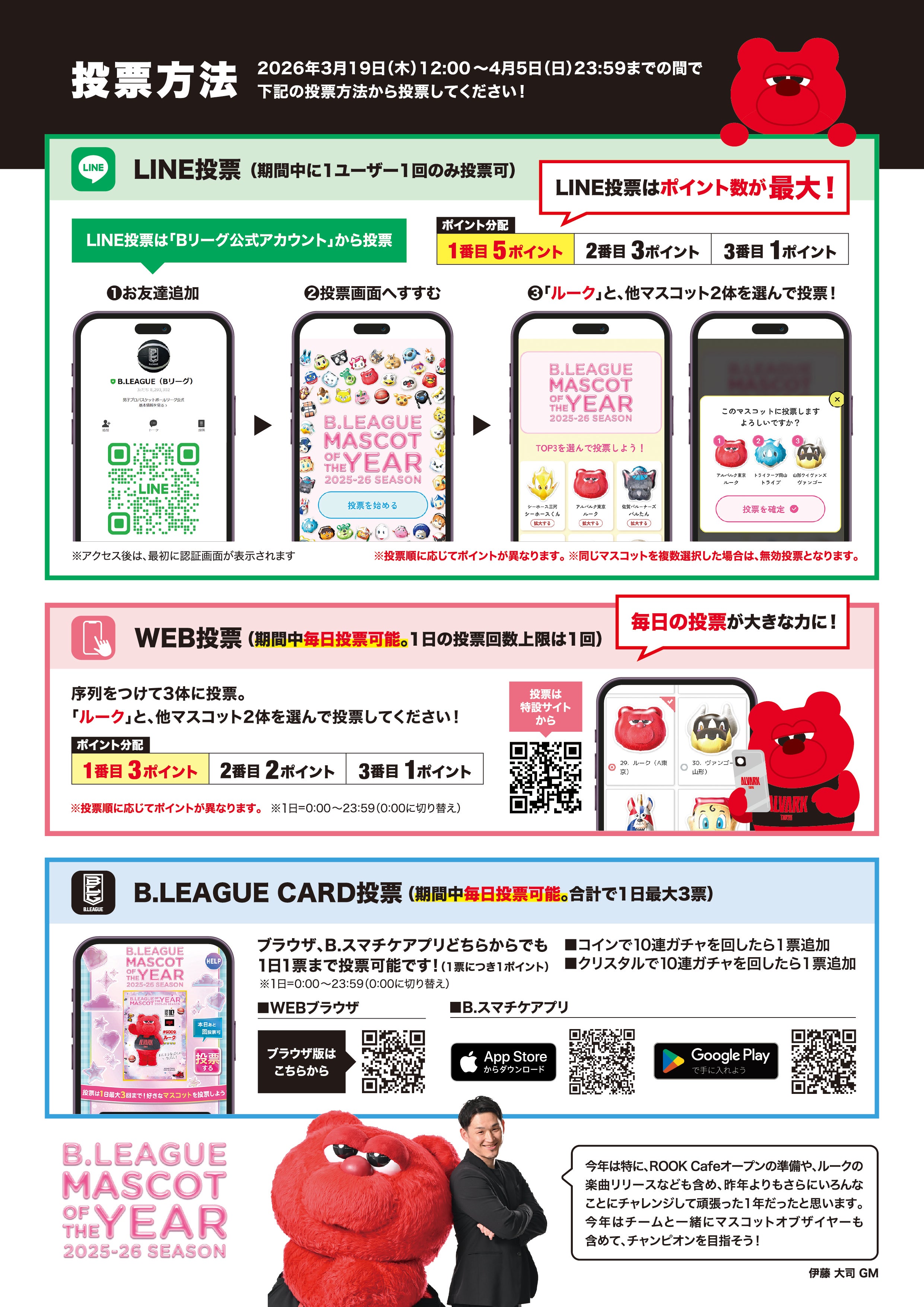 | ファンコミュニティ投票 | 新たに追加された投票方法。B.LEAGUE公式LINEコミュニティ「B.LEAGUE FAN ROOM」の推しマスコット投票ひろば!チャンネル で投票可能。 |