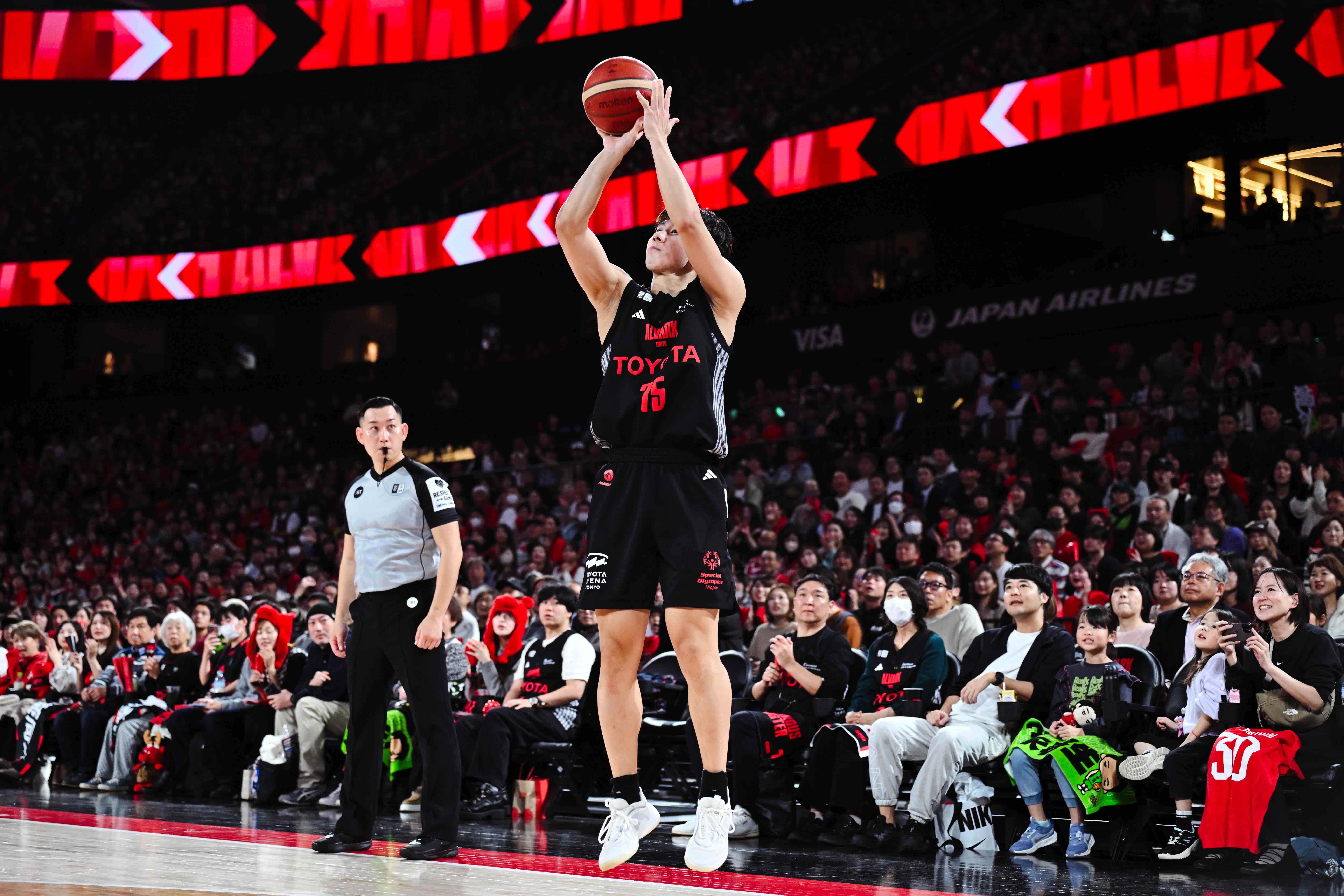(ー4Q最後、安藤選手からのアシストで小酒部選手が決めたスリー後、2人で笑顔でぶつかり合った、その時の気持ちは?)いやもうめちゃめちゃ嬉しかったですね。もう入ったと思ったし、オサもすっごい笑顔で走ってきたから!もう、どうしよどうしよ、ぶつかるぶつかると思うんですよ。でもあれぐらいやっぱ2人で喜びを分かち合えたっていうのは、本当にあのスリーで試合を決めたと思うので、2人で試合を決定づけられたのは本当に嬉しいことかなと思います。