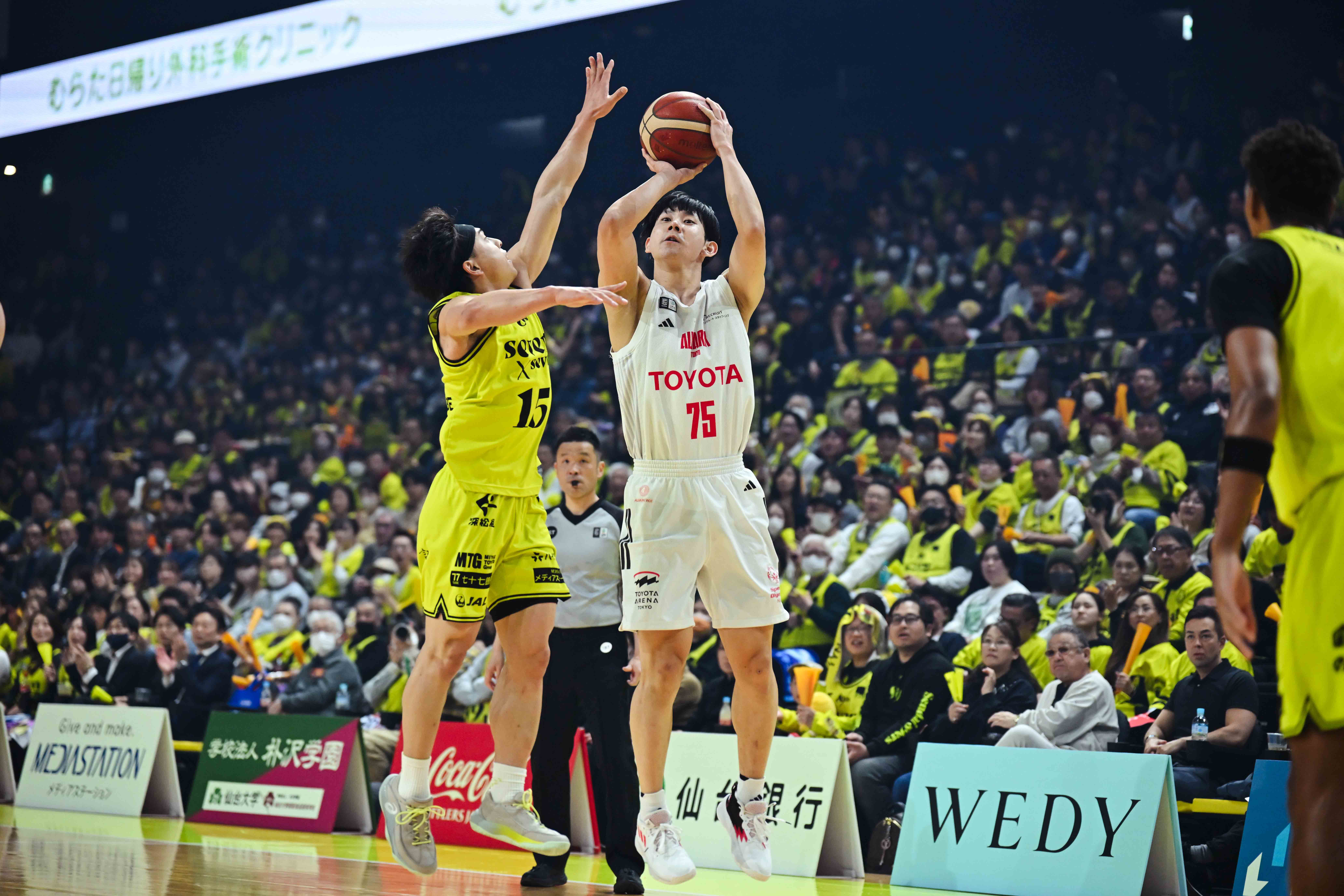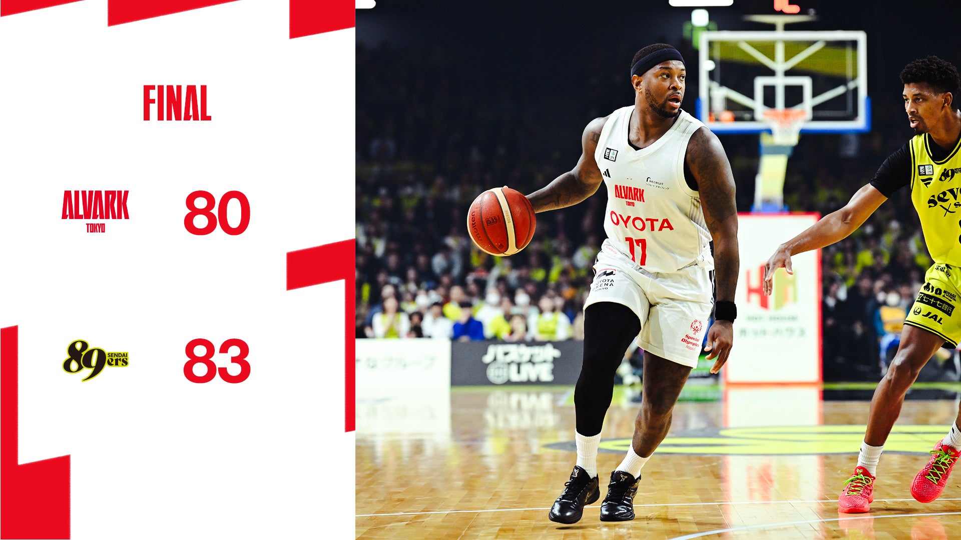 スターターは、#0 デイヴィス、#3 テーブス、#9 安藤、#11 サイズ、#75 小酒部。1Q、#75 小酒部がディフェンスの隙を突き、スピードを生かしたドライブで先制。オフェンスではプレーを作っていこうとするがリズムを掴めず、相手には速い展開に持ち込まれイージーな得点も許して最大6点ビハインド。終盤、#17 フォスターが2本のスリーを決めるが、5点を追いかける展開で最初のクォーターを終える。2Q、ディフェンスの強度も上がり、オフェンスもボールを動かして、#75 小酒部の連続スリーなどリズムが出始め、開始から5分間で17-5と勢いに乗る。オフィシャルタイムアウト後も勢いは衰えず、#17 フォスターの4本目のスリーをはじめ確率良く加点。ラストポゼッションではディフェンスリバウンドから#10 ザックが自ら持ち込みそのままフィニッシュ。このクォーターを30-12と圧倒し、前半#17 フォスターは14得点、#75 小酒部13得点の活躍。13点リードで前半を折り返す。3Q、相手もアップテンポに得点を狙ってくる中、#0 デイヴィスがスコアだけでなく、広い視野で仲間を生かすアシストでも躍動するなど、一時は20点差までリードを広げる。しかし、ラスト3分でターンオーバーもかさみ、2-12と一気に追い上げに遭う。10点差に詰め寄られて最終クォーターへ。4Q、開始早々から相手の連続スリーで会場のボルテージも一気に上がる。苦しいショットが続き、ついに3点差まで詰め寄られる中、#3 テーブスのペイントアタックから#9 安藤がキャッチアンドスリーを沈める。これで流れを断ち切りたいところだったが、相手も速い展開からインサイドに繋いでバスケットカウント。さらに続けて得点を許し、ついに1点差。オープンショットも決め切れず我慢の時間が続くが、#17 フォスターが切り込んで貴重な得点を挙げる。オフィシャルタイムアウト明け、互いにショットが外れる中で抜け出したのは仙台。残り1分25秒、ついに同点に追いつかれる。この局面でもターンオーバーから速い展開に持ち込まれて与えたフリースローで逆転を許すと、続く攻撃もターンオーバーで繋がらない。2点を追いかける中、#3 テーブスがピックを使ってタフなショットを決め切り、残り21秒で何とか同点に。そして、守り切らなければいけないディフェンスだったが、無情にもコーナーでオープンを作られ、劇的なスリーを決められて80-83。最後の攻撃も届かず、最大20点リードから逆転での敗戦を喫した。