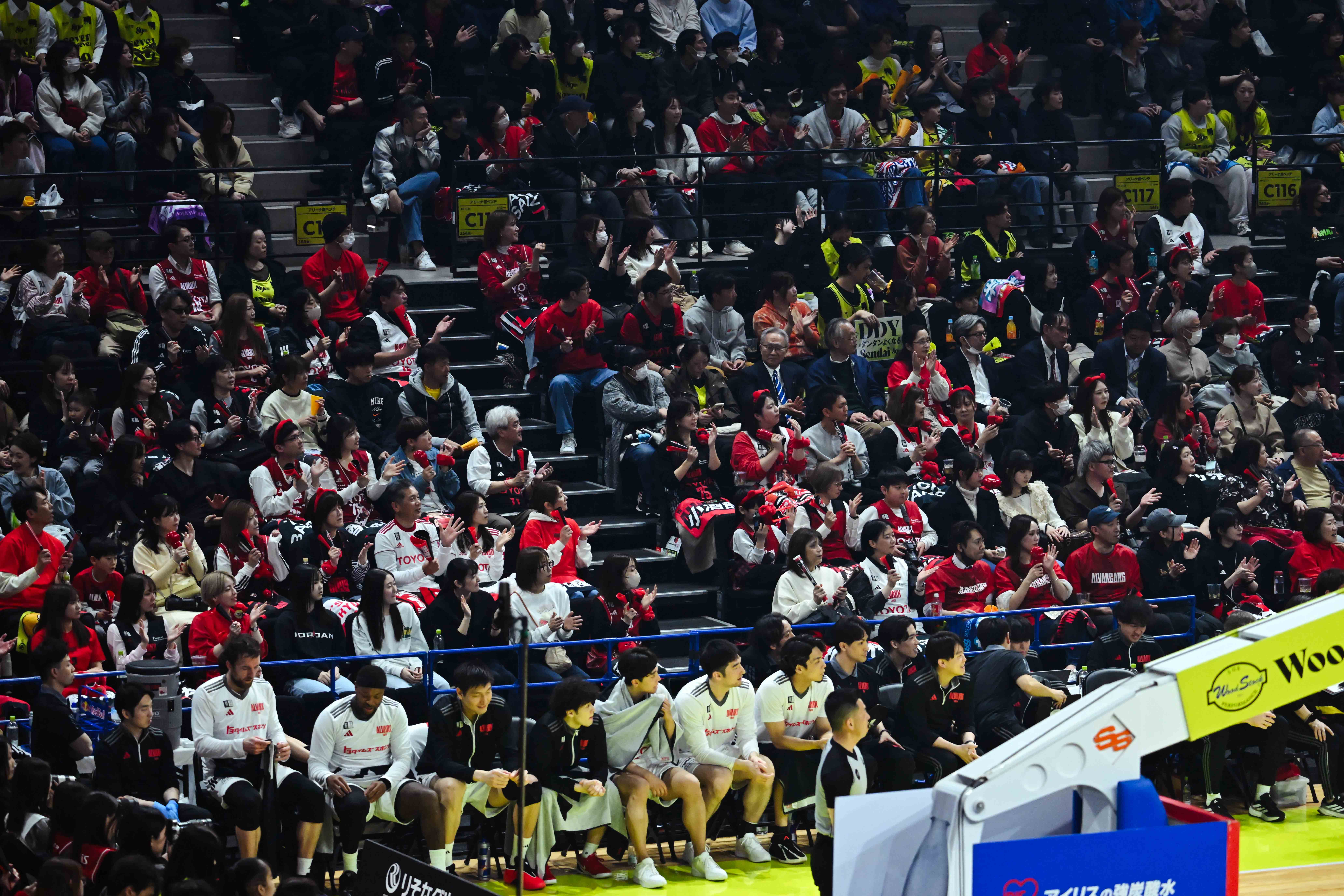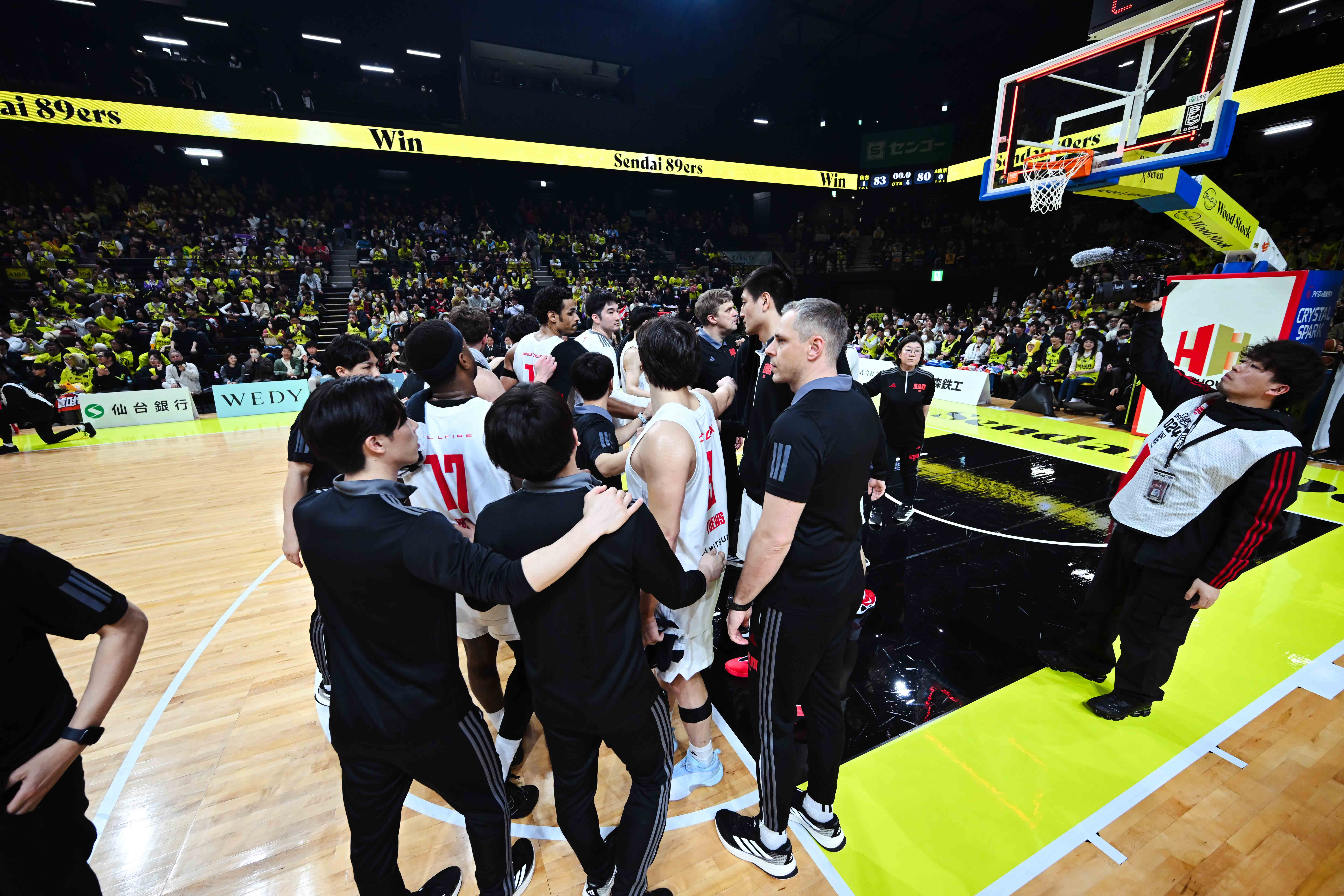 4月1日(水)に開催された仙台89ERS戦は、序盤は互角の立ち上がりから、自分たちのバスケを我慢強く続けて一時は20点ものリードを作りましたが、終盤にミスから相手にも勢いを与えてしまい、大逆転を許して悔しい敗戦を喫しました。辛い結果となったこの試合にも、遠い仙台の地でともに戦ってくださるファンの皆さんの姿がありました。相手の勢いに飲み込まれ、相手ホームが大歓声に包まれる中でも、声を張り上げてチームとともに戦ってくださり、本当にありがとうございました。また配信を通じて応援いただいた皆さまにも御礼申し上げます。