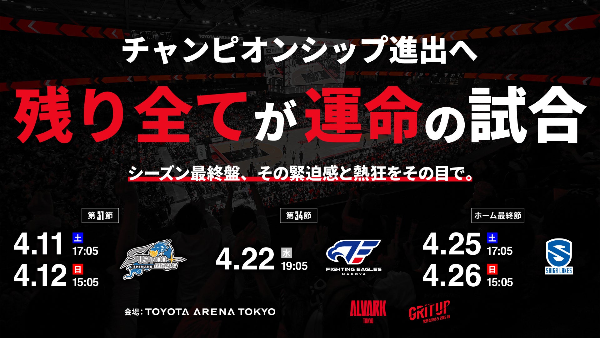 ここからレギュラーシーズン最終盤、チャンピオンシップ進出に向けて、1試合も落とすことはできない試合が続きます。残り10試合のうち5試合はTOYOTA ARENA TOKYOでのホームゲーム。ここからがバスケの一番面白い時期です。どうか会場でその緊迫感と熱狂を感じてください。そして、ともに勝利とCSへの切符を掴み取りましょう。