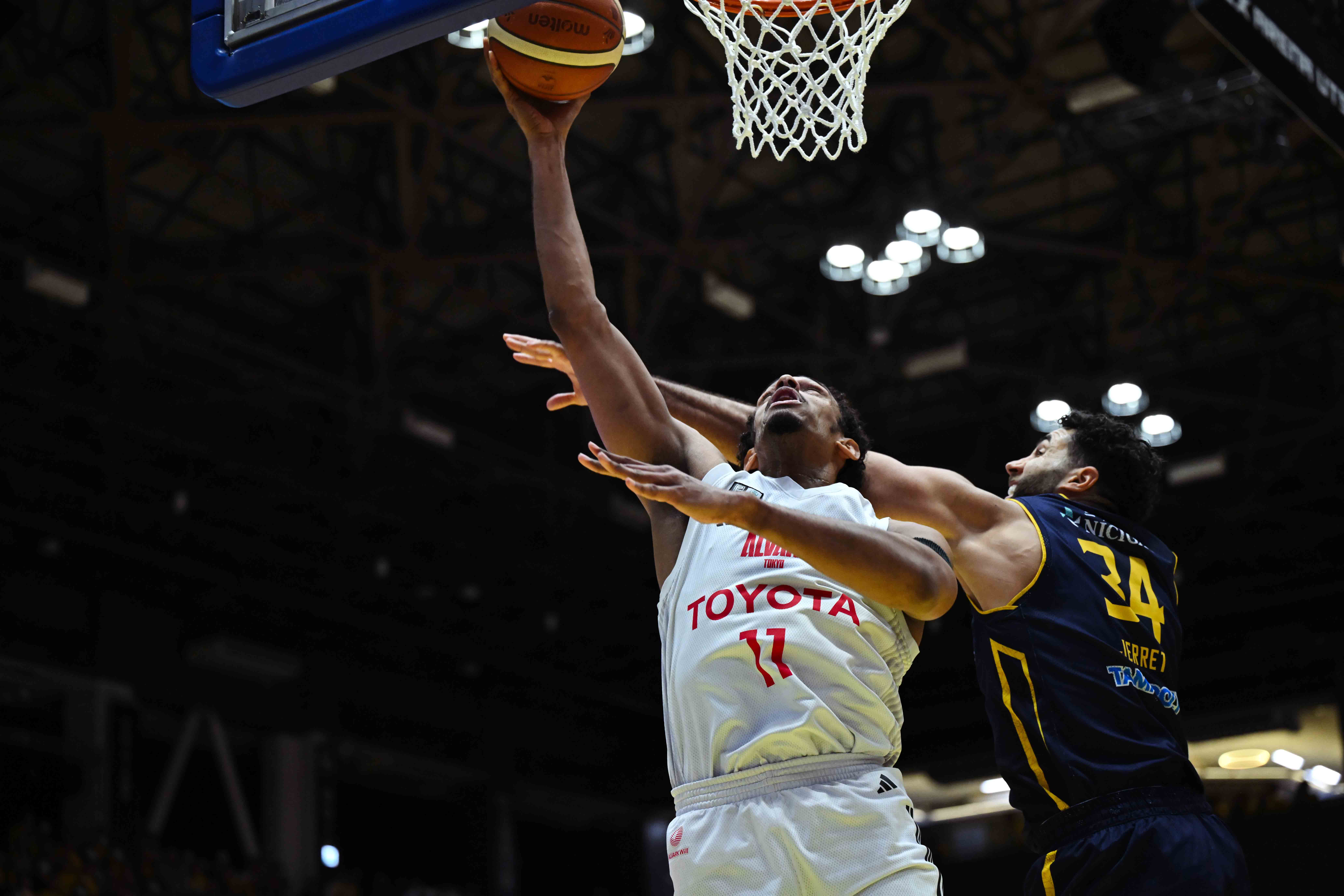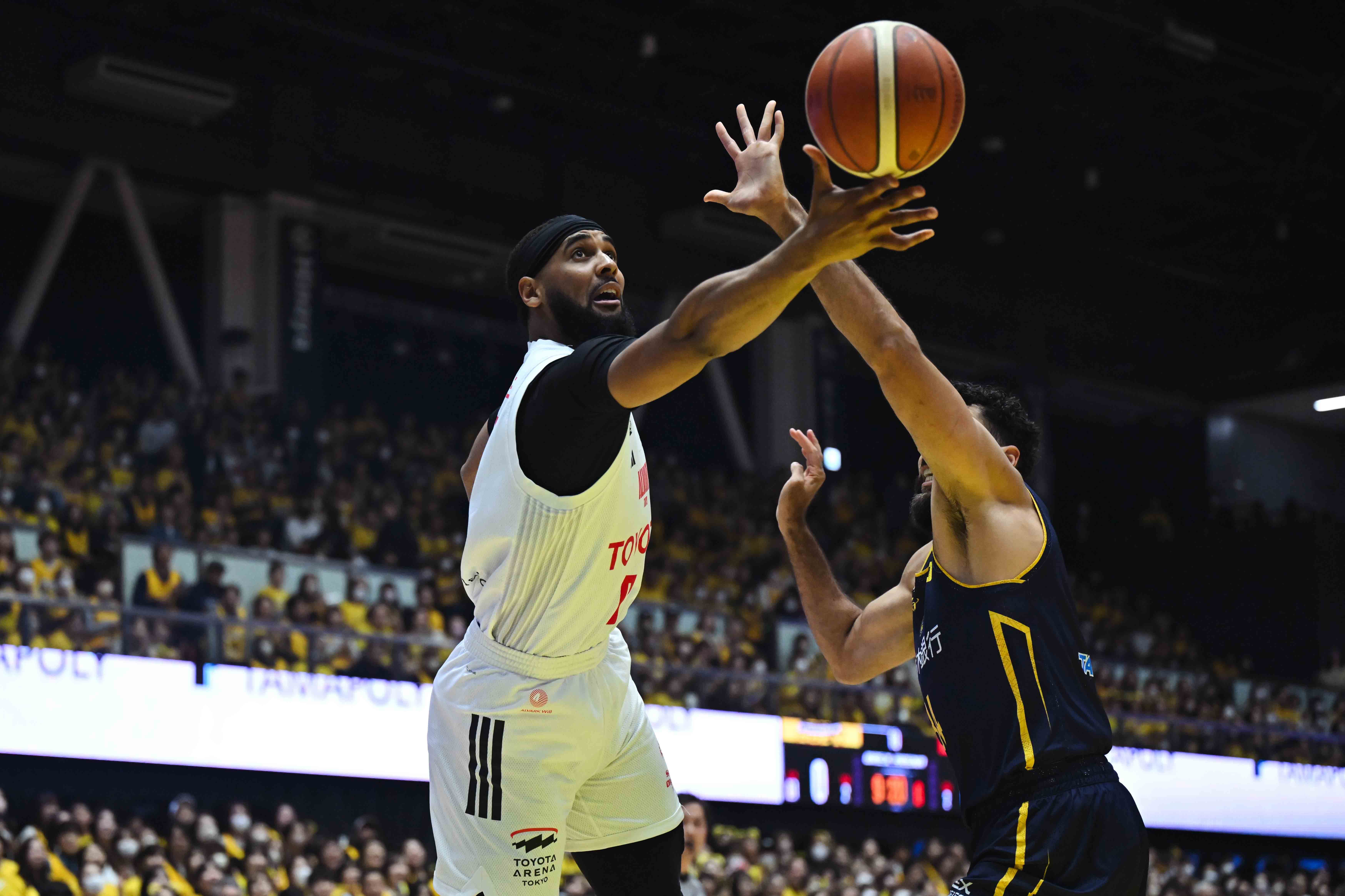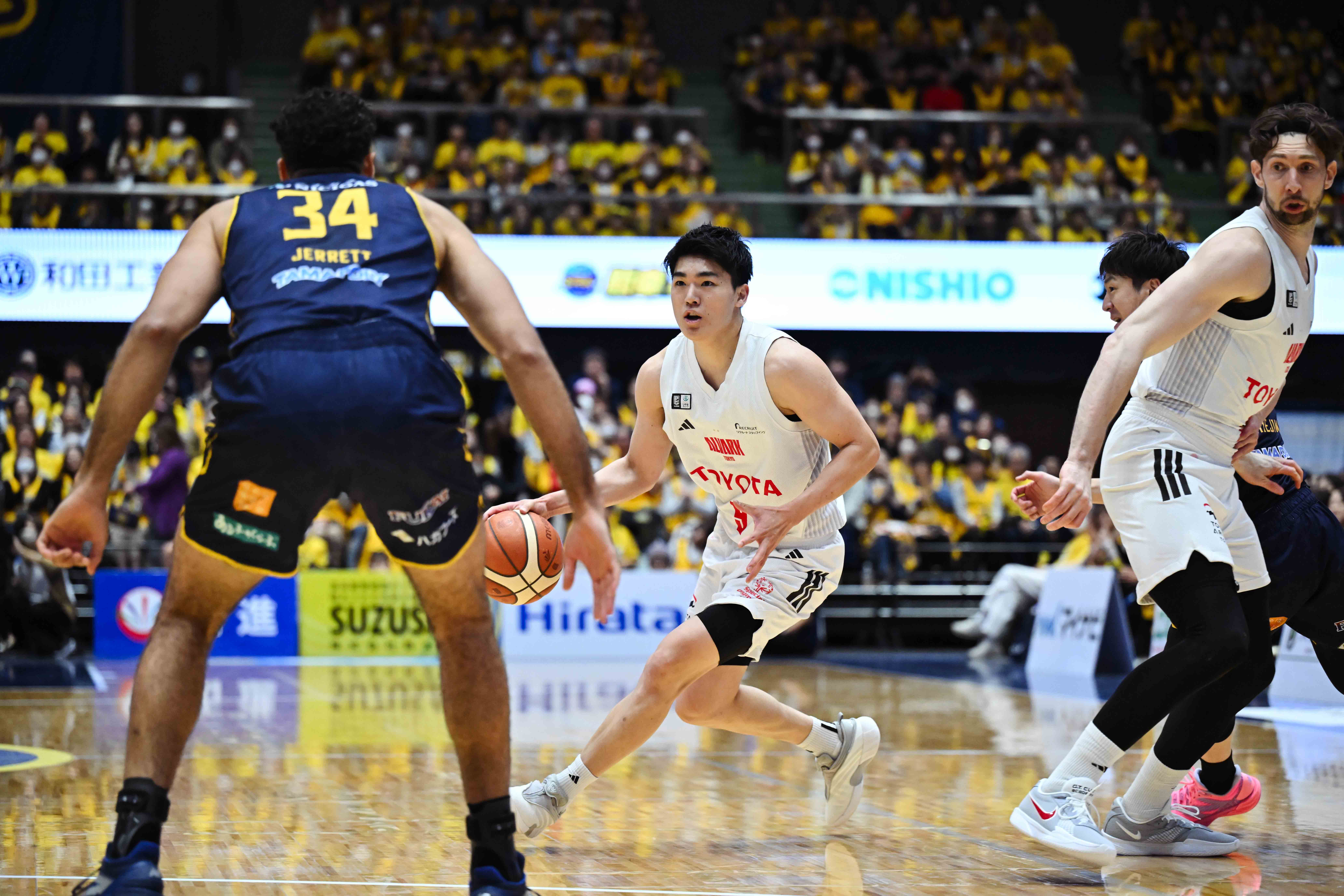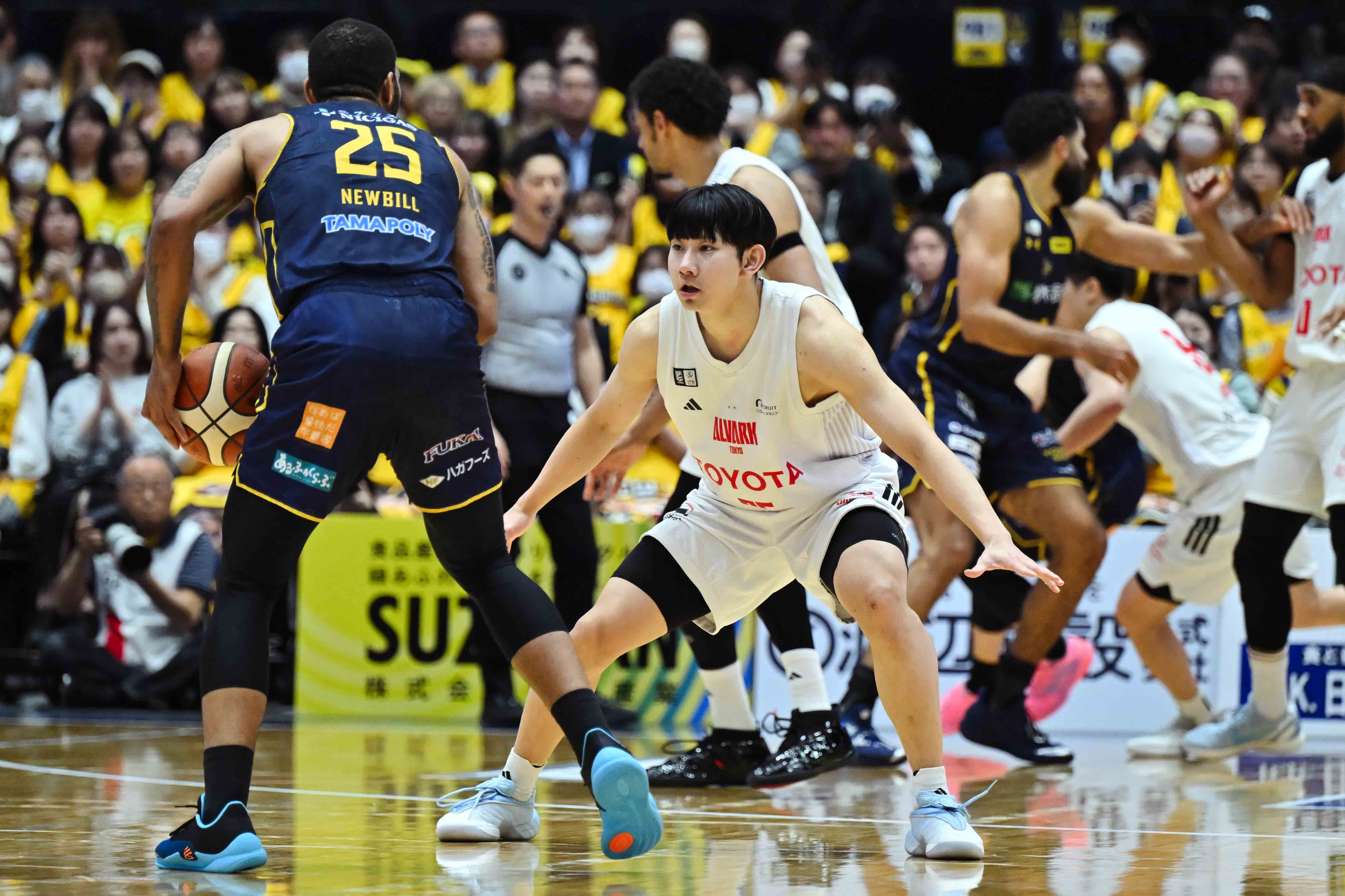 1Q、#0 デイヴィスの1on1で先制。すべてのポジションで強度の高い、見ごたえのあるマッチアップが繰り広げられる。相手の外れたショットをしっかりリバウンドで抑え、途中出場の#22 ロシターのスクリーンを使って、#9 安藤や#75 小酒部もリズムよくシュートを決めていく。開始から4分半で14-3とまずまずの立ち上がり。相手のタイムアウト明け、連続で得点を許すが、落ち着いてオフェンスを展開。バランスよく加点し、6点リードを保って最初のクォーターを終える。