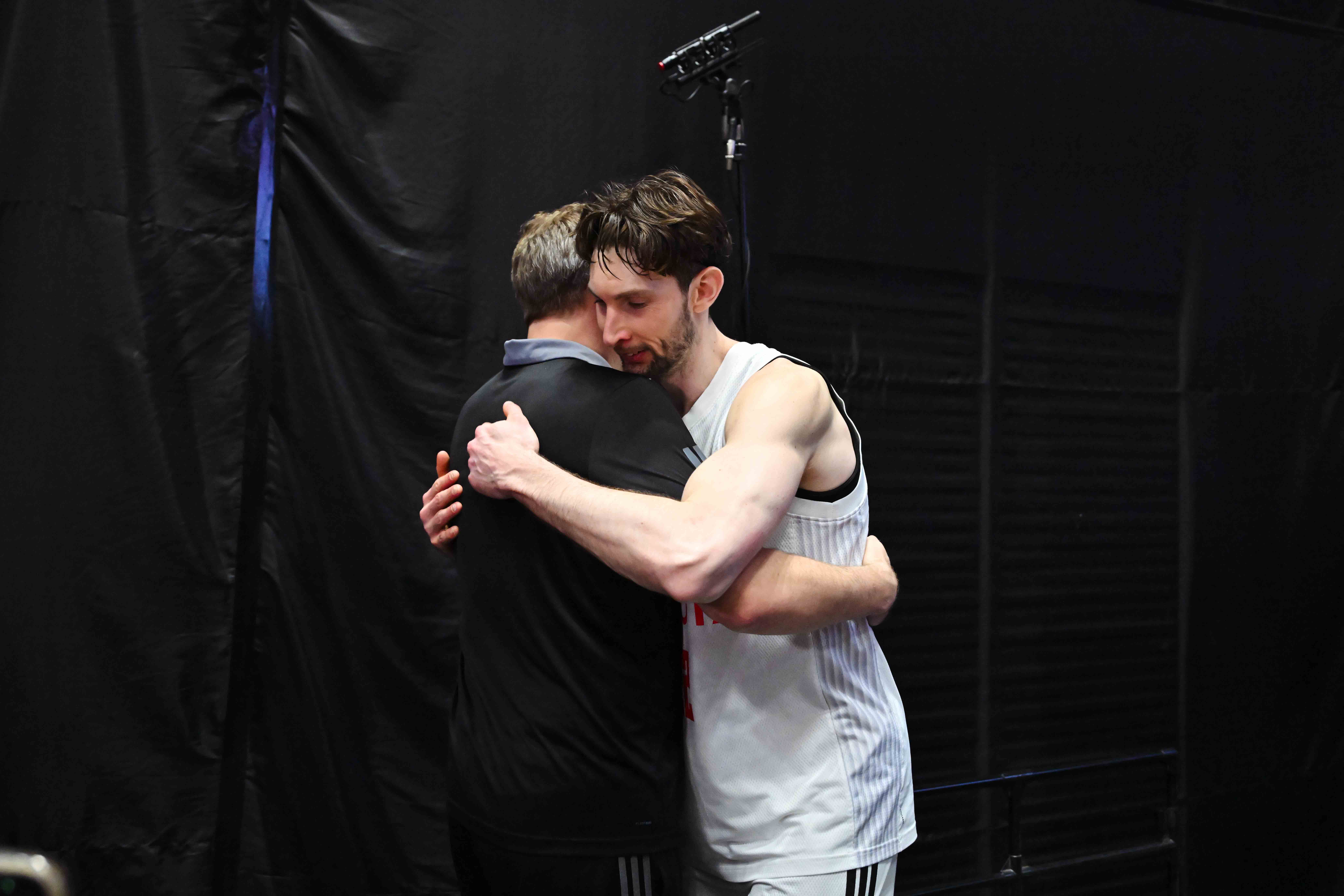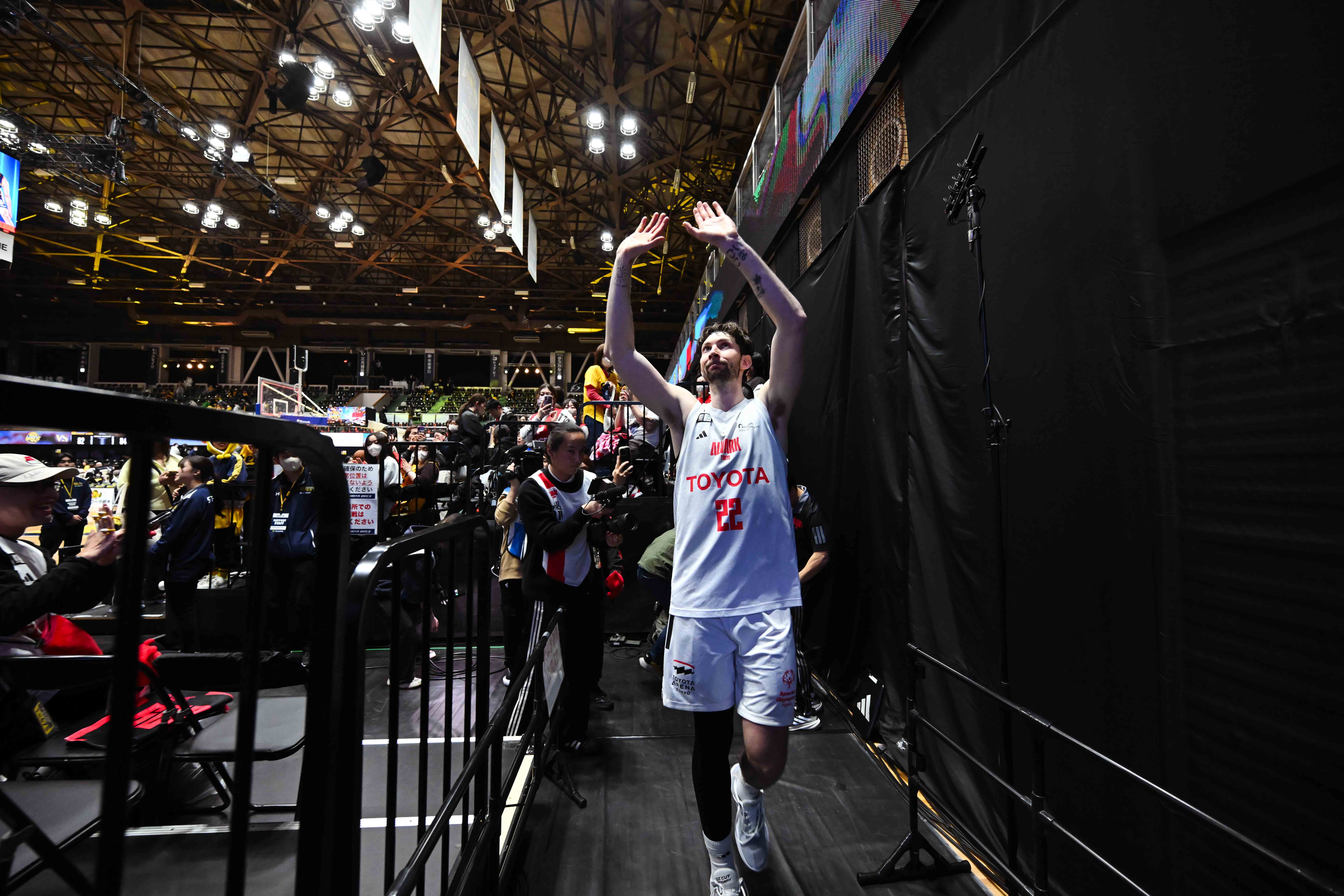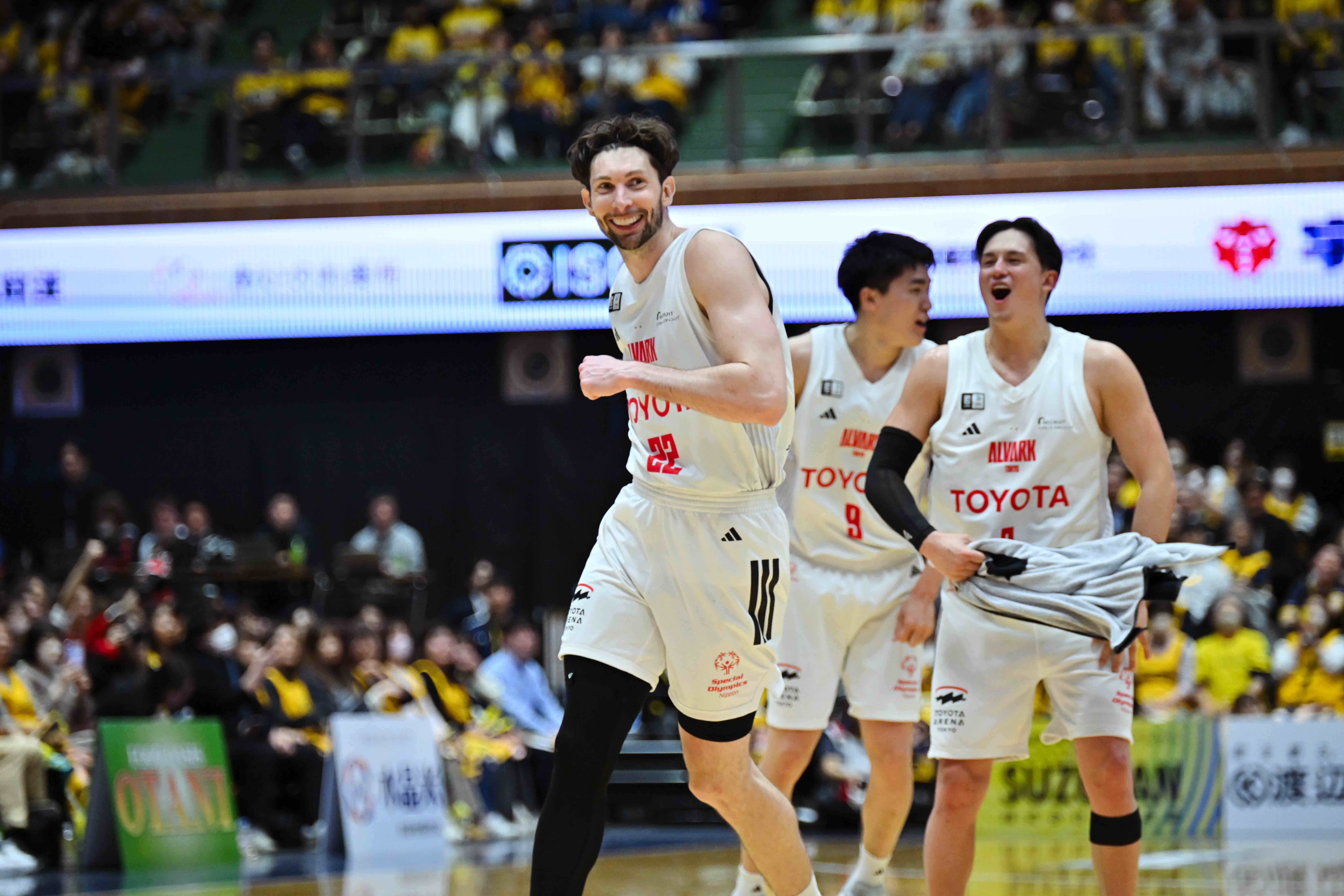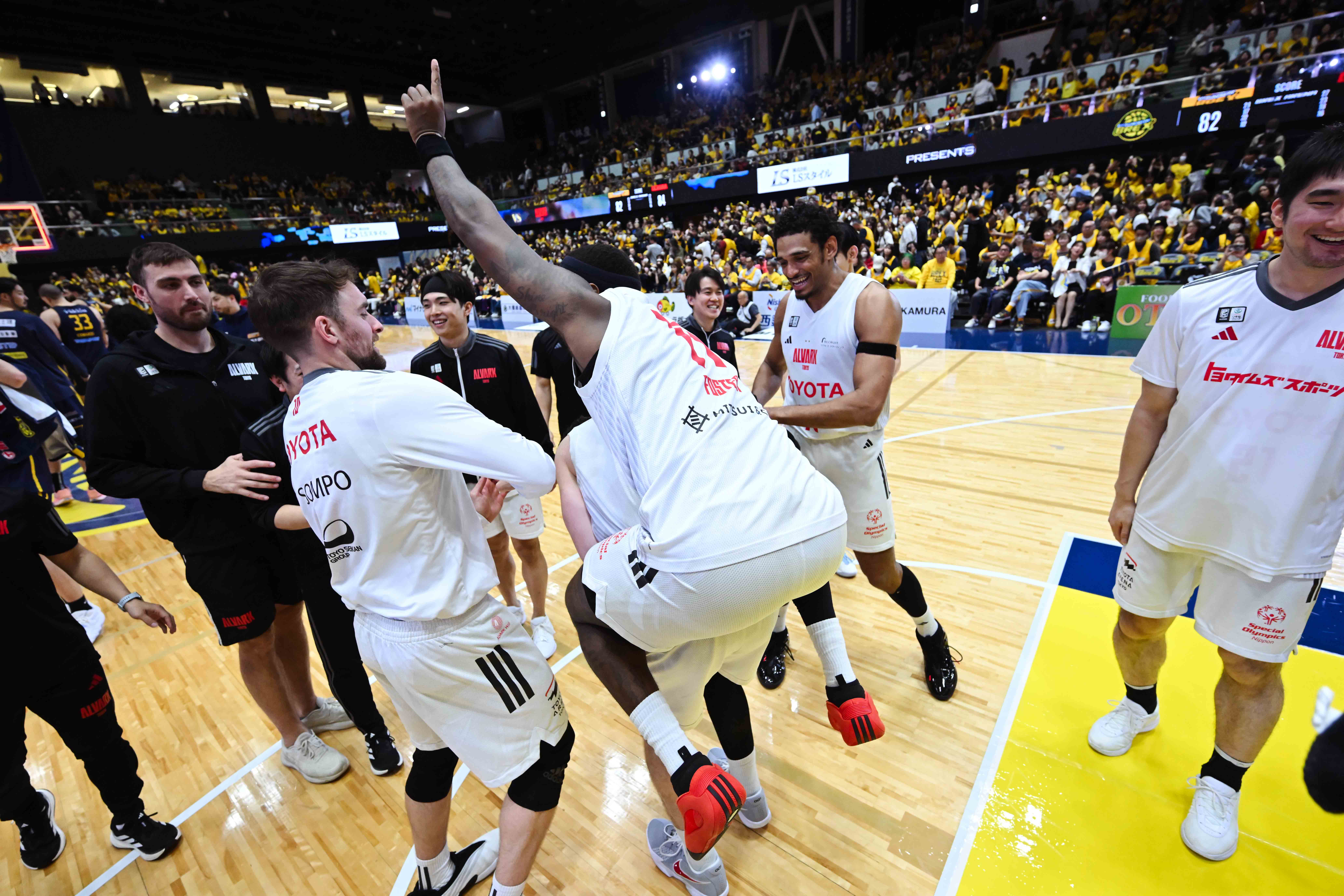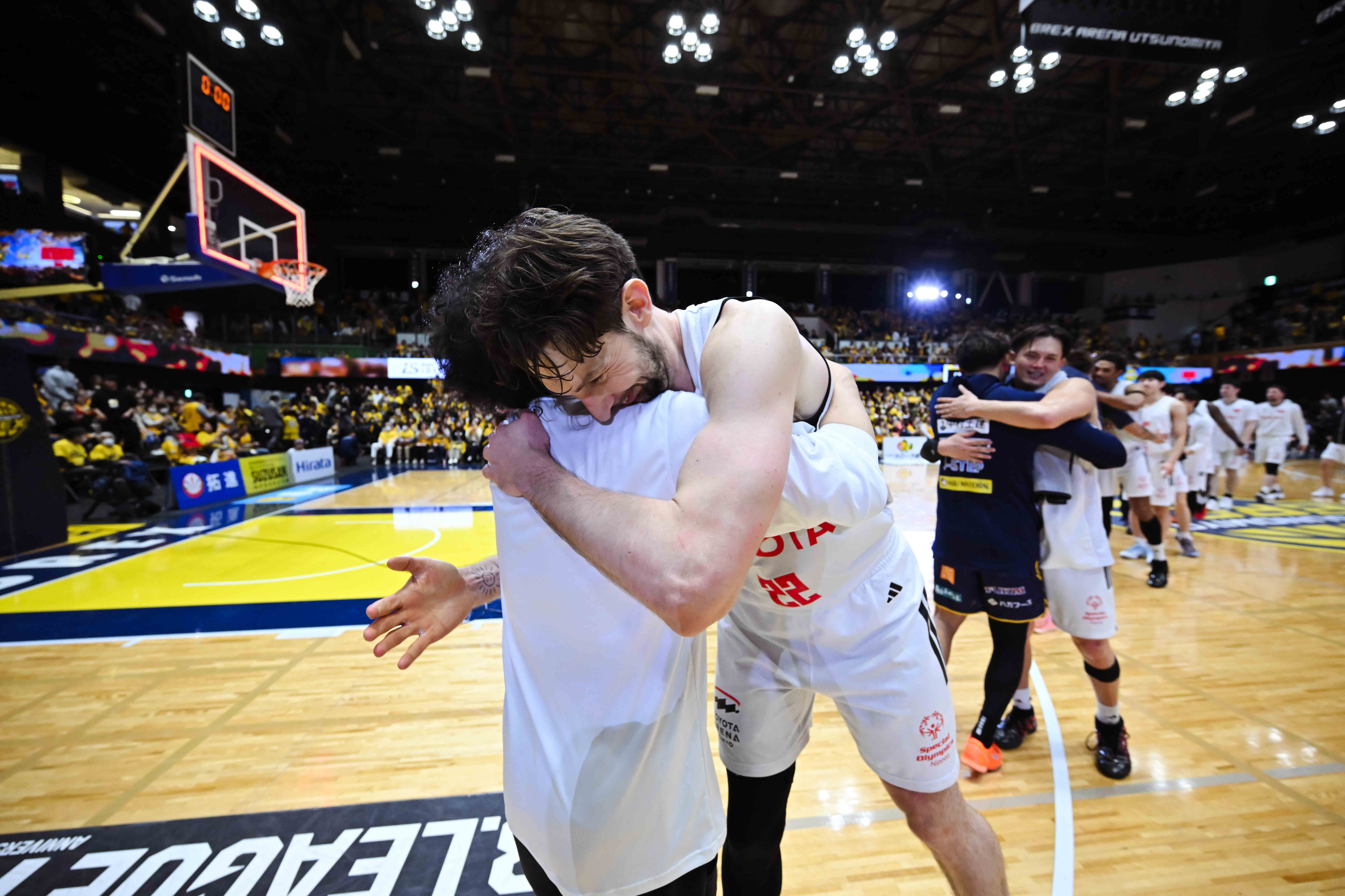 4Q、互いに守り合う中、冷静沈着に#9 安藤がディフェンスを見てリングを射抜き先制。すぐさま相手も返すが、#3 テーブスが魂のこもったバスケットカウントを獲得し奪い返す。互いに流れを捉えきれず、息もつかせぬ一進一退の激しい攻防が続き、4点を追いかける中でオフィシャルタイムアウトへ。タイムアウト明け、#17 フォスターの起死回生の3ポイントがネットを揺らし1点差。すぐに返されて3点を追いかける中、アドマイティスHCは最後のタイムアウトを使う(3:41)。次の攻撃、#3 テーブスとのPnRでパスを受けた#11 サイズが#75 小酒部のスクリーンを駆使しながら、全身全霊の気迫でこじ開けるようにねじ込む。続くディフェンス、この試合でもニュービルと並び圧倒的な存在感を放つ#34 ジェレットの攻撃を守り切ると、再び#3 テーブスは#11 サイズでのプレーを選択。続けてのプレーに対応する相手ディフェンスからフリースローをもぎ取ると、#11 サイズはこれを2本とも決め切り逆転に成功する(2:45 80-79)。一歩も譲らない激しいディフェンスの応酬で互いにショットが外れる中、次に貴重な得点をあげたのは、今日が怪我からの復帰戦となった#22 ライアン・ロシターだった。相手ディフェンスに阻まれながらもボールシェアを続ける中、打開できず24秒ギリギリでペイントで受け取ると、片足でバランスを取りながらも絶対に落とせないタフショットを沈め、追加点をもぎ取る(1:31 82-79)。しかし、この時間帯でもさすがは王者宇都宮、焦りを見せず#34 ジェレットが鮮やかに3ポイントを決め返し、同点とする(1:12 82-82)。ブレアリ全体のボルテージも最高潮に達する。そして、互いにシュートを決め切れず同点で迎えた残り7.9秒、ファウルコールでラストポゼッションは宇都宮ボールに。神様は最後はホームチームに微笑むのか——そんな思いがよぎる異様な空気の中、宇都宮のタイムアウトを挟み、“このディフェンスにすべてを懸ける”、コート上の5人はハドルを組む。ファウルもできない苦しい状況の中、フロントコートから再開。スローインから#25 ニュービルがパスを受けたその瞬間だった。#75 小酒部と#0 デイヴィスが猛然と襲いかかるようにプレッシャーをかけ、ボールを奪う。#0 デイヴィスはそのまま迷わずドリブルで持ち込み、ステップで相手をかわしながらショットを放つ。リングに弾かれたボール——そこに飛び込んでいた男がいた。#22 ライアン・ロシターだった。試合時間、残り0.4秒。値千金のプットバック。誰もが息を呑む決勝点が決まったその瞬間、会場は時が止まったかのようだった。そして、悲鳴と歓声。それぞれの感情が一気に溢れ出す中、アルバルクファンのライアンコールは確かに響いた。そして最後の相手攻撃も凌ぎ切り、勝利の瞬間。そこには、#22 ロシターのもとへ、誰よりも早く満面の笑みで駆けつける#3 テーブスの姿があった。