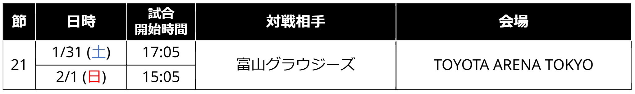 - 対象試合:1月31日(土),2月1日(日)富山グラウジーズ戦