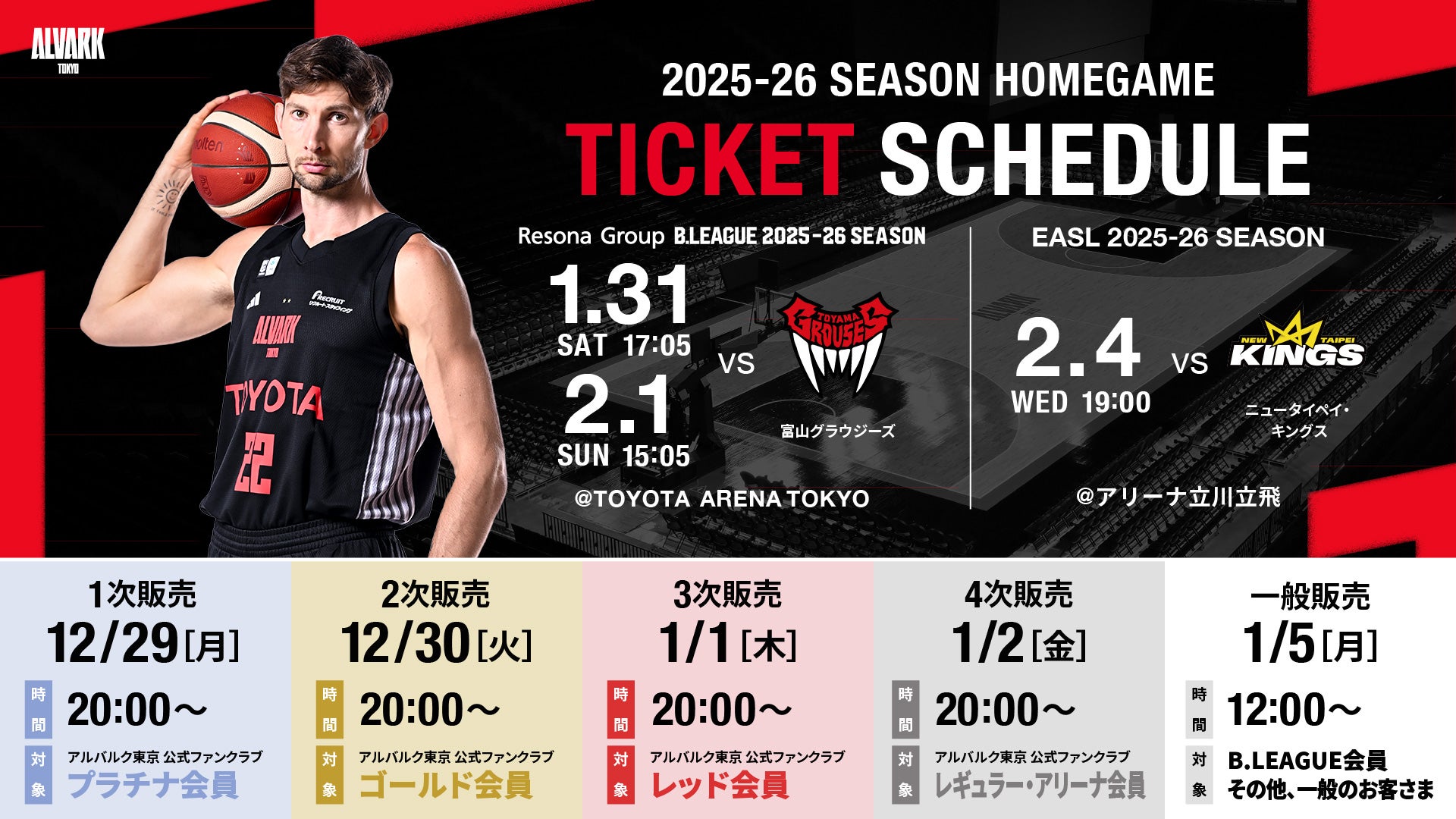 2025年12月29日(月) 20:00より、りそなグループ B.LEAGUE 2025-26 SEASONの第21節 富山グラウジーズ戦、東アジアスーパーリーグ(East Asia Super League 以下:EASL) 2025-26シーズン ニュータイペイ・キングス (チャイニーズ・タイペイ)戦のホームゲームチケット販売を開始いたします。