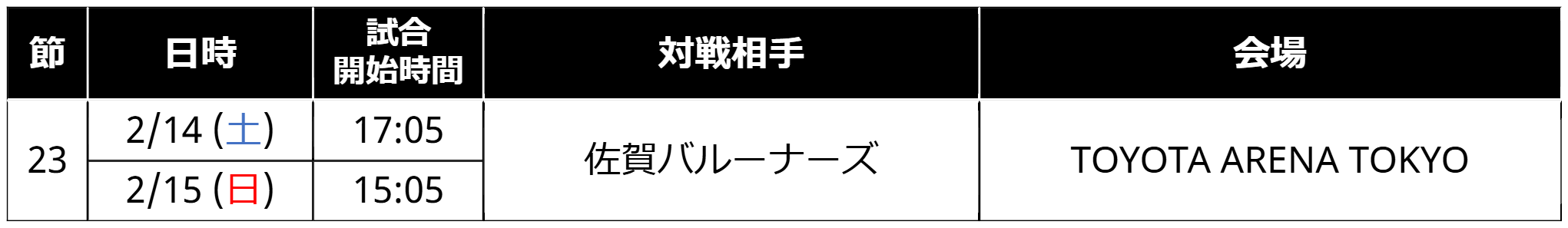 - 対象試合:2月14日(土),15日(日)佐賀バルーナーズ戦