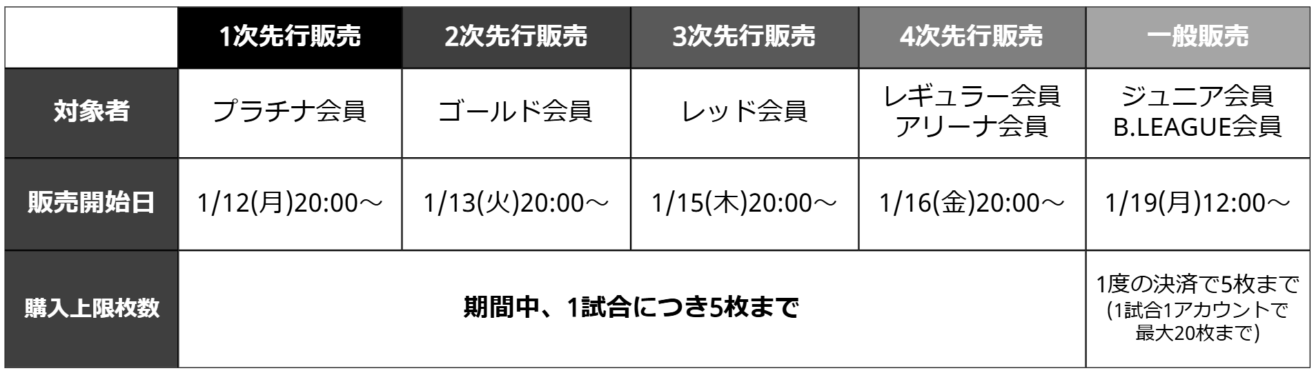 - ※各試合の引き換え可能チケット枚数に上限を設定させていただきます。各グレードの先行販売開始タイミングからの引き換えとなるため、グレードによっては引き換え開始時にチケットがない場合がございます。