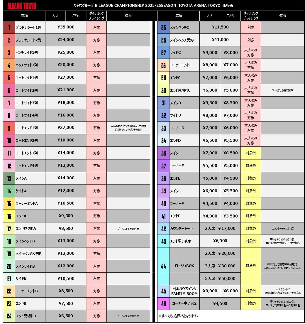 ダイナミックプライシングの対象座席は、試合前日の価格から+500円となります。